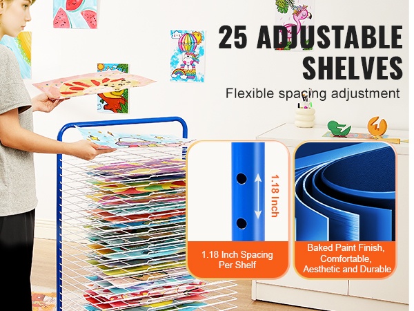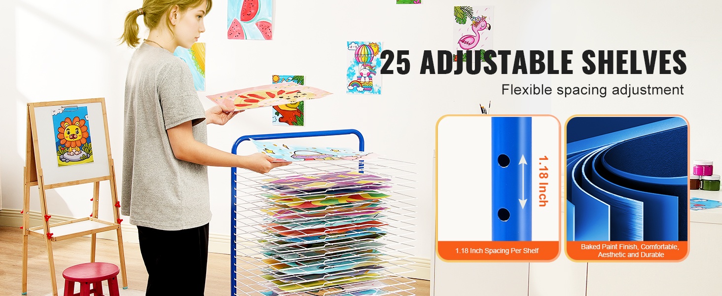 Kaikki 25 hyllyä ovat säädettävissä eri kuivaustarpeiden mukaan, ja ne voi helposti lisätä tai irrottaa, jotta märät työt eivät sotkeudu. Metallirakenne ja jauhemaalattu pinta tekevät pinnoista sileitä, mikä vähentää naarmuuntumisriskiä ja parantaa kestävyyttä sekä ulkonäköä.