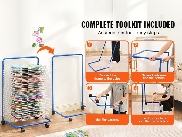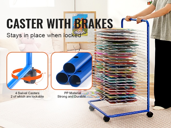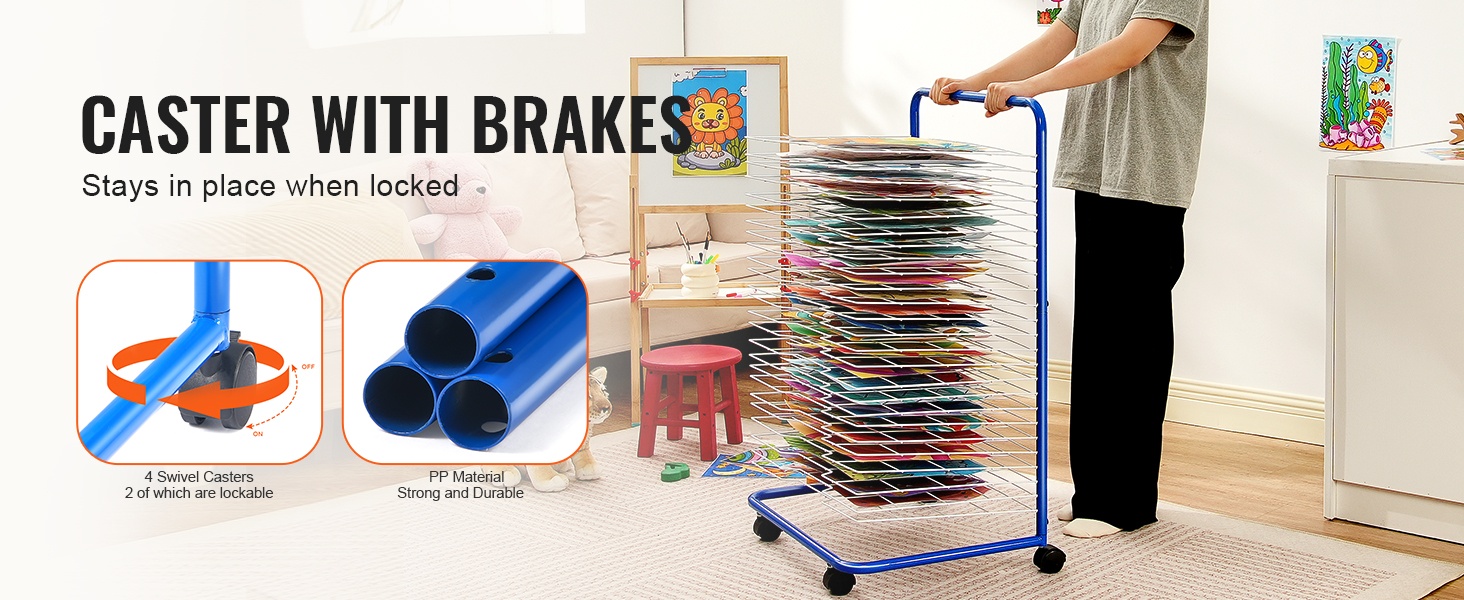 Taideteosten kuivausteline, jossa on 25 irrotettavaa hyllyä, tarjoaa käytännöllisen ratkaisun paperien, maalausten ja muiden töiden kuivaamiseen luokkahuoneissa, päiväkodeissa, taidestudioissa ja kotona. Teräksinen rakenne ja lukittavat pyörät tekevät telineestä kestävän ja helposti liikuteltavan.