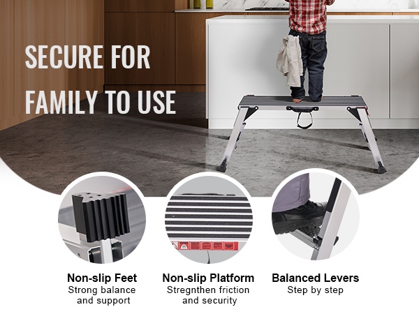 Taitettavan jakkaran työskentelytasossa on pitävä pinta, joka vähentää liukastumisriskiä ja parantaa vakautta käytön aikana. Liukuestejalat varmistavat tukevan pidon lattialla ja estävät alustan heilumisen tai liukumisen.