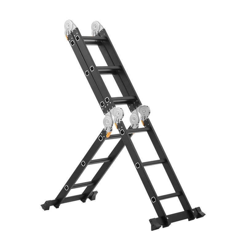 Tämä monikäyttöinen taitettava tikas kattaa monenlaiset korkeustarpeet kotona, työssä ja ulkona. Vahvistetusta alumiinista valmistettu rakenne kestää taivutusta ja muodonmuutoksia. Saranakulma on säädettävissä 35°, 107° ja 180° -asentoihin, mikä lisää vakautta ja käyttömukavuutta eri tilanteissa.