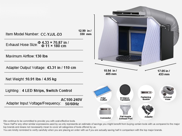 Kannettava ilmasivellinsuihkutuskoppi tarjoaa tehokkaan kaksipuhaltimen poiston, 4 LED-valaistusta, jopa 6 jalan poistoletkun, vaihdettavan suodattimen, kääntöalustan, helpon puhdistuksen ja taitettavan säilytyksen, joka sopii pieniin tiloihin pitäen maalisumun hallinnassa.