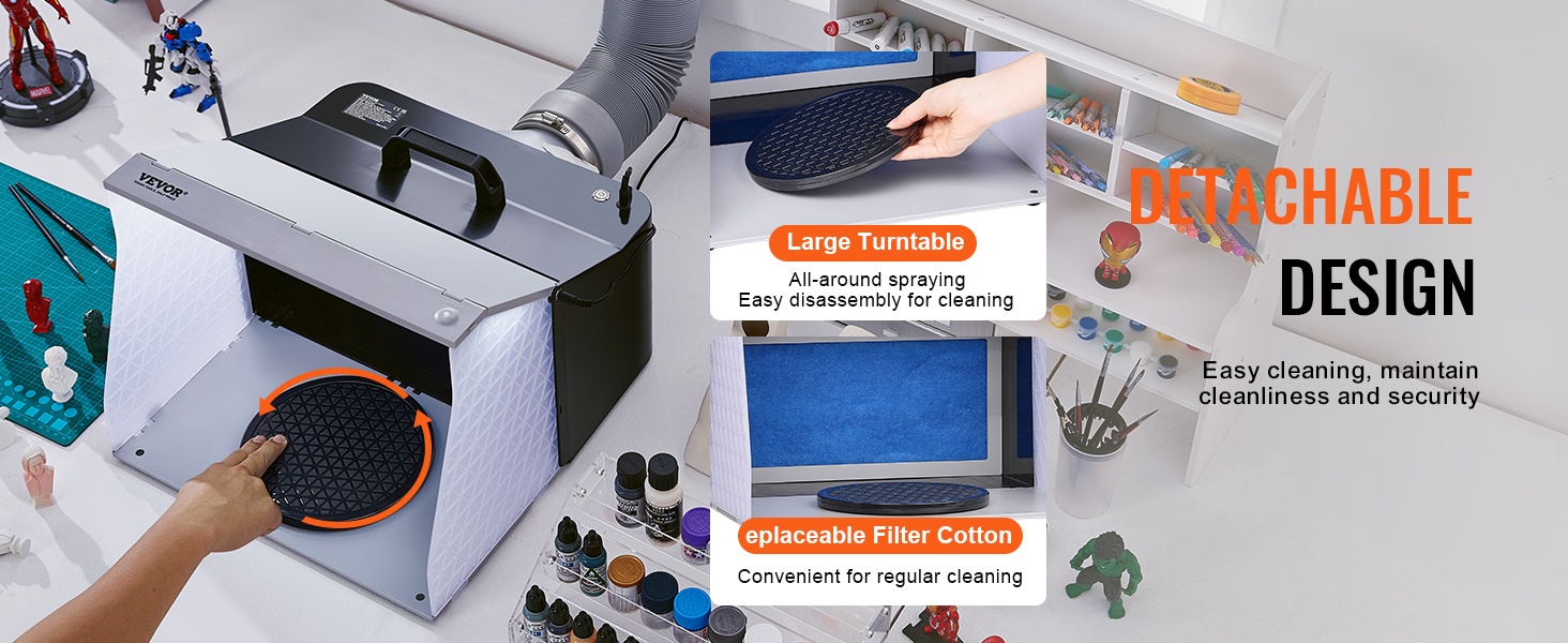 Suuri kääntöalusta helpottaa työkappaleen kääntämistä ja tarkastelua eri kulmista. Alusta on irrotettava puhdistusta varten, ja vaihdettava suodatin auttaa pitämään maalausympäristön siistinä.