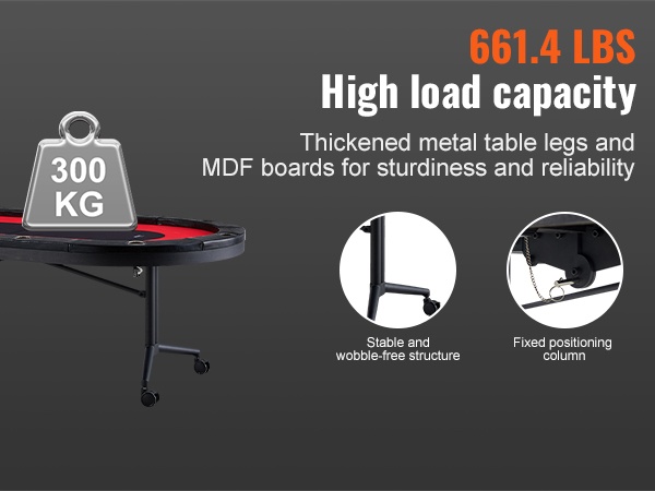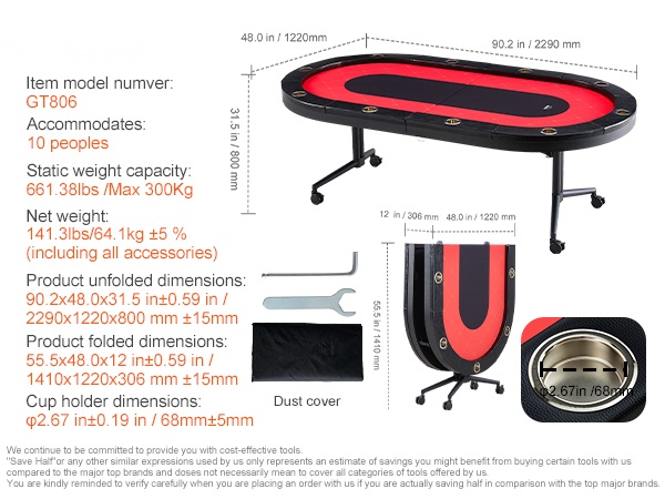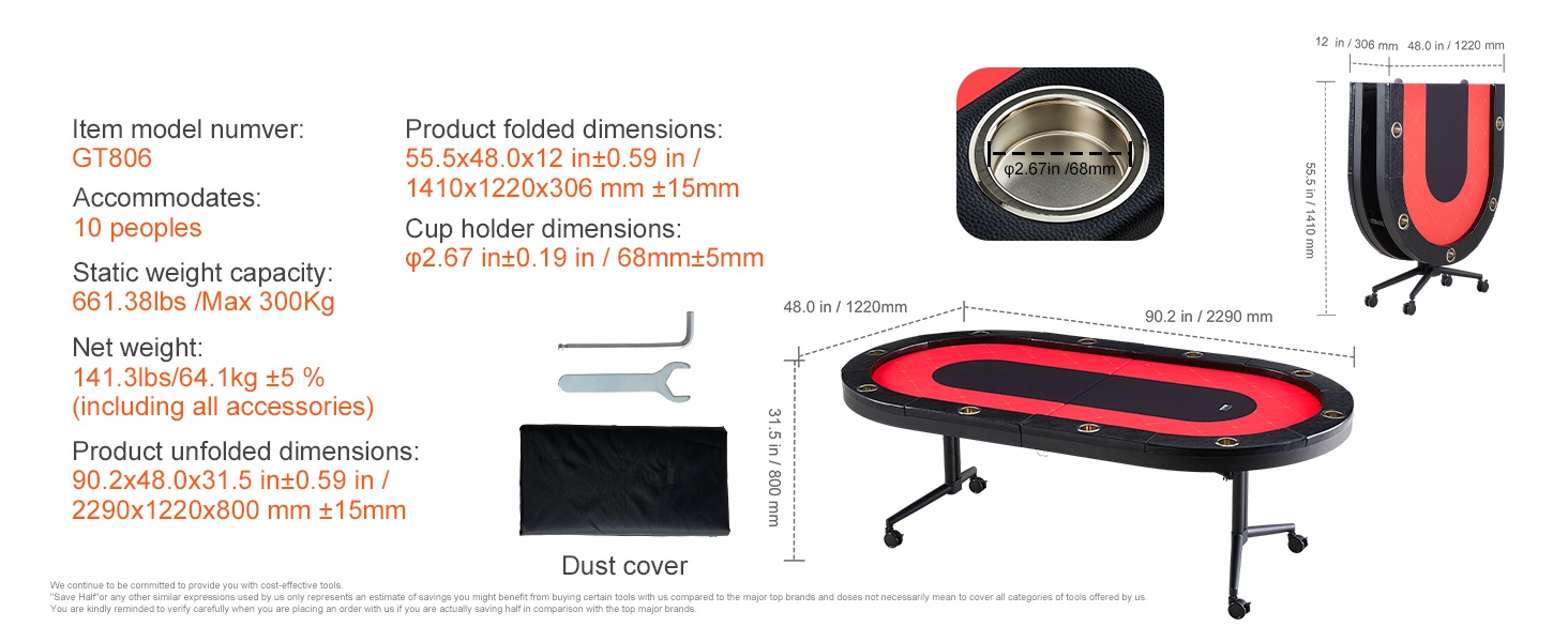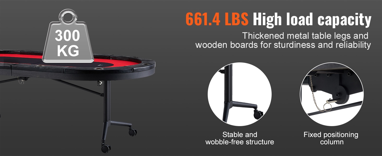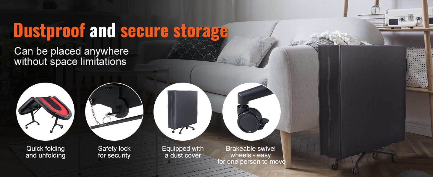 Soikea kasinotyyppinen pöytä on nopea asentaa käyttövalmiiksi ja taittuu helposti kasaan säilytystä tai kuljetusta varten. Sisäänrakennettu turvalukitus estää pöytää taittumasta tai löystymästä itsestään. Mukana tulee myös pölynsuoja, joka pitää pöydän puhtaana, kun se ei ole käytössä.
