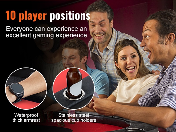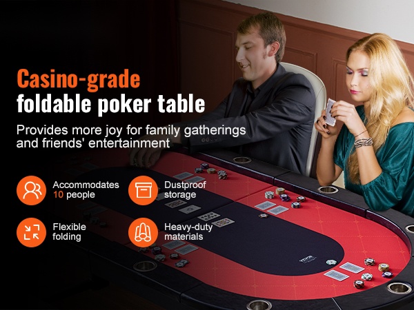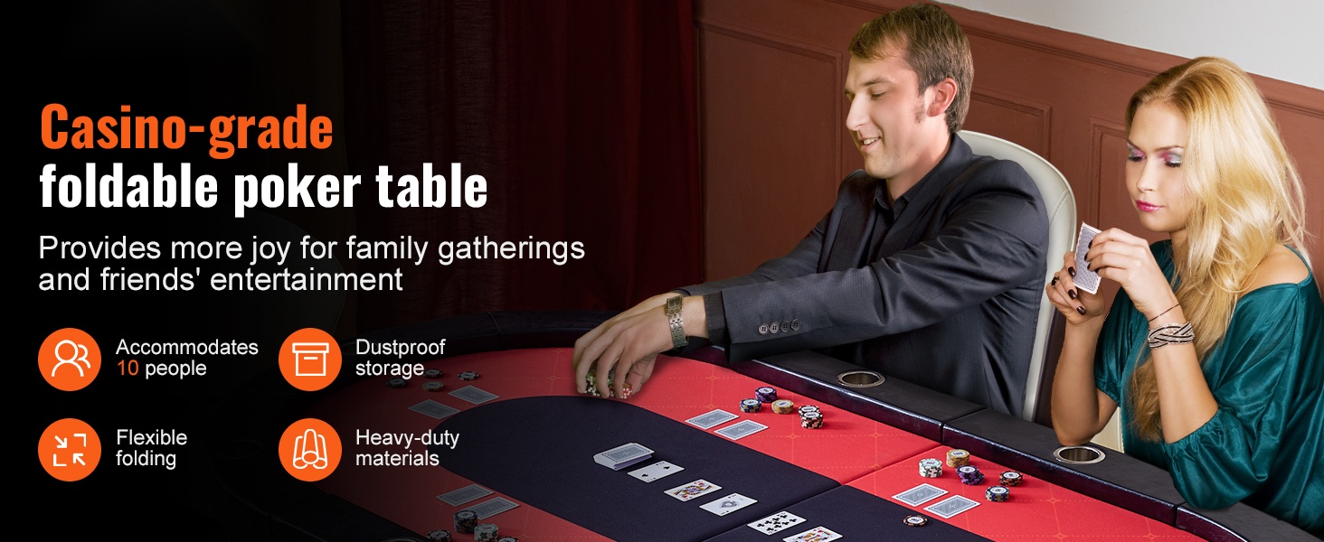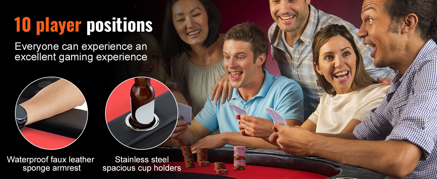 Tämä taitettava ja tukeva pokeripöytä on suunniteltu vapaa-ajan pelaamiseen. Pöydän ääreen mahtuu samanaikaisesti 8 pelaajaa, joten se sopii erinomaisesti Texas Hold’em -pokeriin ja muihin korttipeleihin kotona, pelihuoneessa tai mökillä.