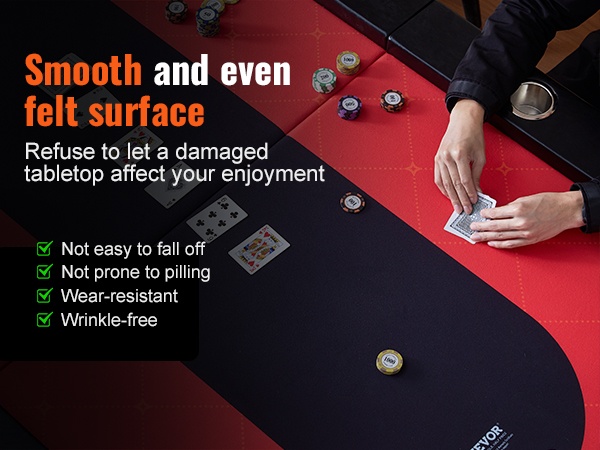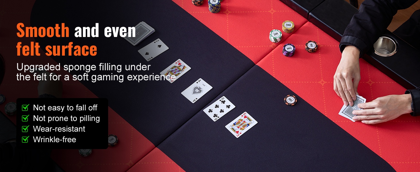 Pöydän pelipinta on sileää ja kestävää huopaa, jolla korttien katsominen, merkkien käsittely ja korttien paljastaminen sujuu vaivattomasti. Pinta on suunniteltu kestämään pitkäaikaista käyttöä ilman nukkaantumista tai kulumista.