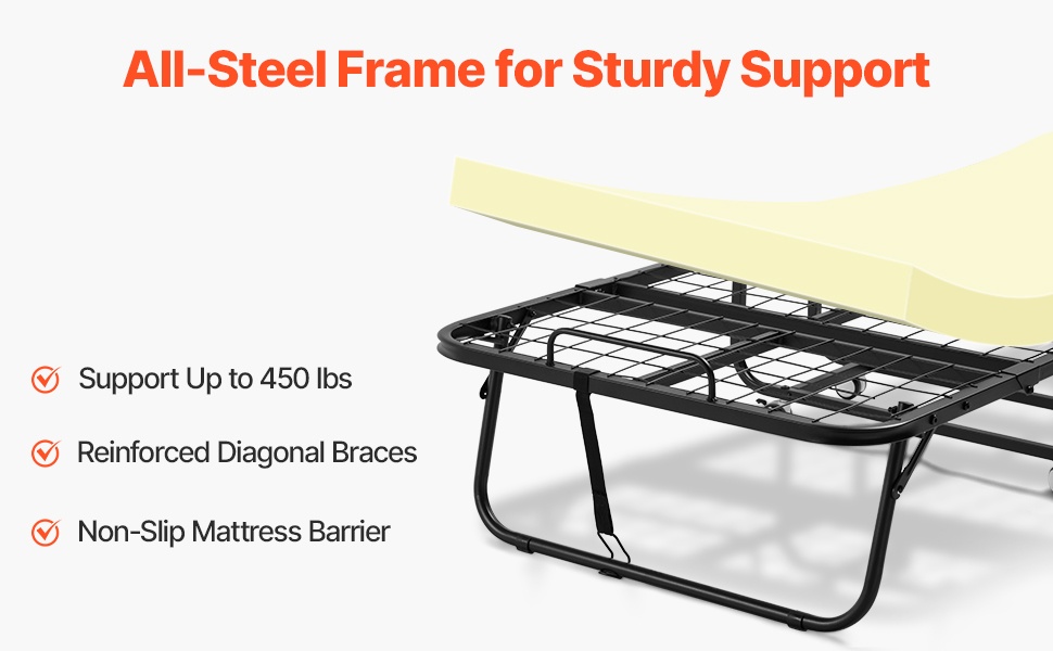 Taittosängyssä on jäykkä metallirunko ja kestävät liitososat, jotka tukevat jopa 450 lbs / 204.1 kg. Rakenne on tukeva ja vakaa, eikä sänky huoju tai menetä muotoaan normaalissa käytössä.