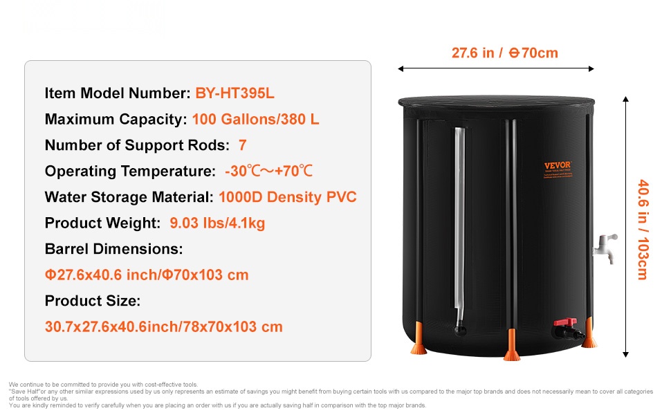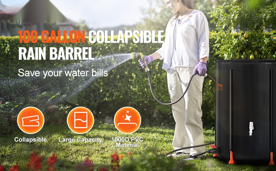 Tämä 100 gallonin taittuva sadetynnyri tarjoaa runsaasti varastointitilaa kuivia kausia ja runsaita sateita varten. Kun säiliö on tyhjennetty, sen voi taittaa kompaktiksi ja säilyttää esimerkiksi auton tavaratilassa tai pienessä varastossa.