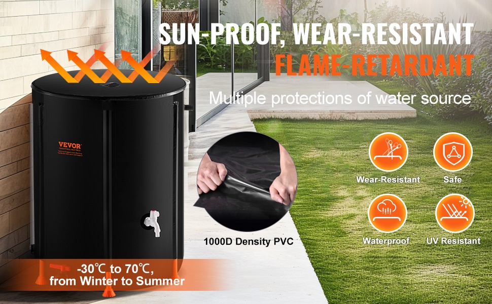Säiliö on valmistettu 1000D PVC:stä, joka kestää sadetta, UV-säteilyä ja kulutusta. Se toimii luotettavasti lämpötila-alueella -30℃–70℃, joten sitä voi käyttää sekä kuumina kesinä että kylminä talvina.