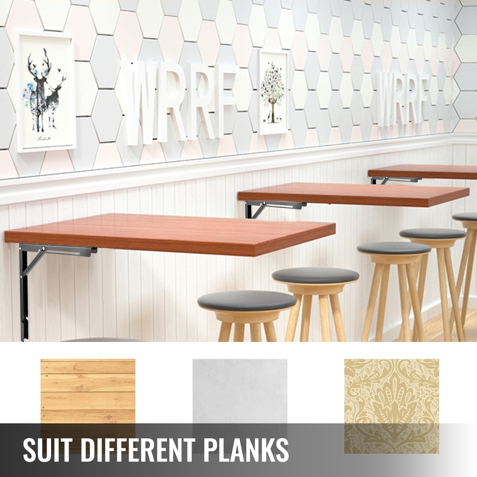 Teräksisen seinäkannattimen koko on 24x22", joten se sopii hyllysyvyyksille välillä 19.7"–31.5". Voidaan käyttää esimerkiksi MDF-levyjen, puuhyllyjen ja muiden vastaavien tasomateriaalien kanssa.