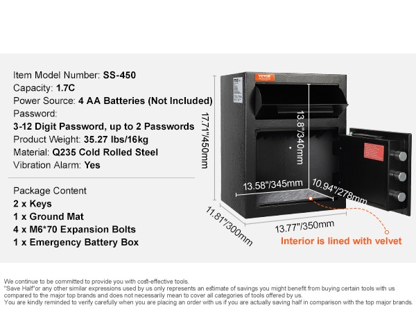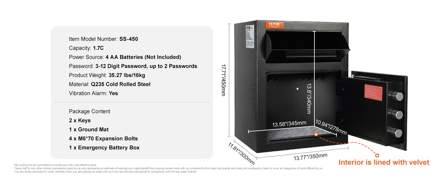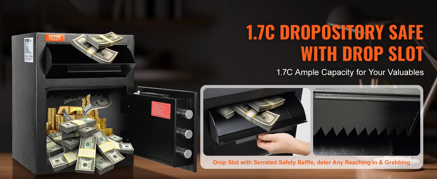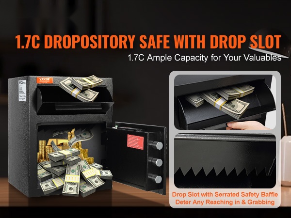 Tässä talletuslokero-kassakaapissa on tilava 1.7C kapasiteetti. Ulkomitat ovat 13.77 x 11.81 x 17.71 tuumaa (pituus x leveys x korkeus), eli noin 350 x 300 x 450 mm. Etupuolella oleva talletusaukko helpottaa käteistä, kirjeitä ja muita asiakirjoja koskevia talletuksia ilman, että ovea tarvitsee avata kokonaan. Tämä lisää sekä käyttömukavuutta että yksityisyyttä.