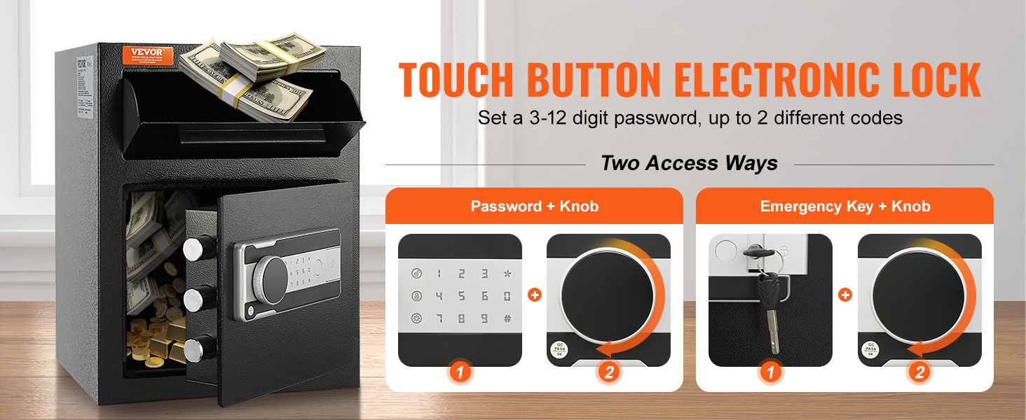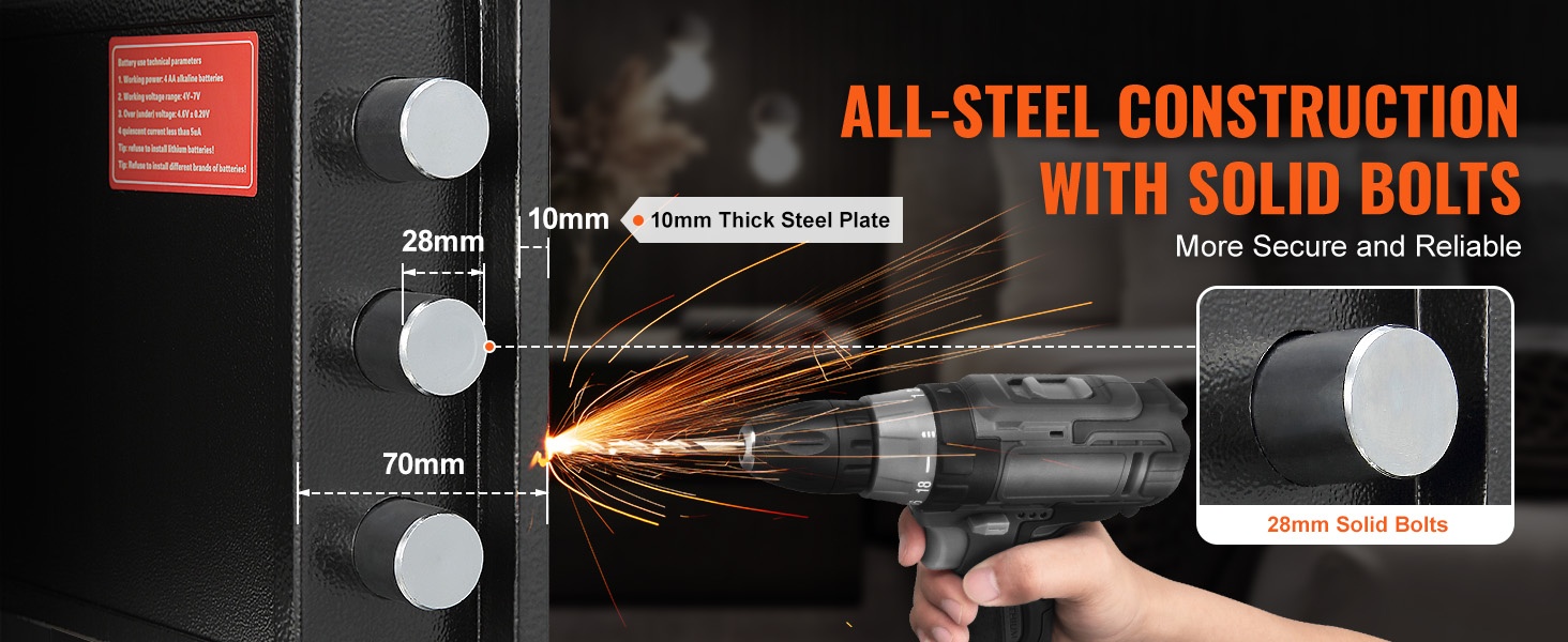 Kassakaappi on valmistettu yhdestä kappaleesta 10 mm paksusta teräksestä, mikä tuo rakenteeseen jämäkkyyttä. Kolme 28 mm massiivista lukitustappia auttavat estämään murtautumista ja luvattomia avausyrityksiä ja sopivat hyvin sekä koti- että yrityskäyttöön.