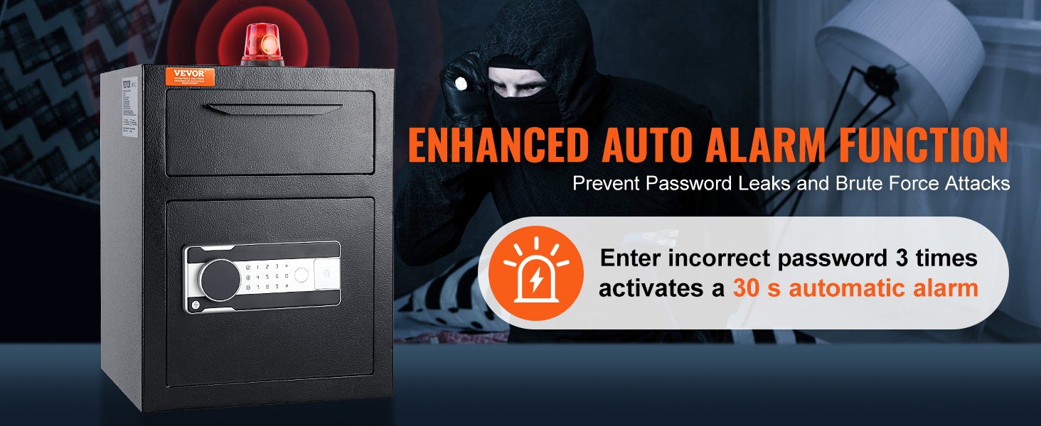 Talletuslokero-kassakaapissa on älykäs 30 sekunnin automaattihälytys. Jos väärä salasana syötetään 3 kertaa peräkkäin, hälytys aktivoituu automaattisesti 30 sekunniksi, jolloin mahdolliset murtoyritykset huomataan nopeasti.