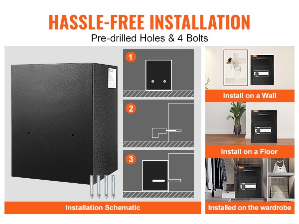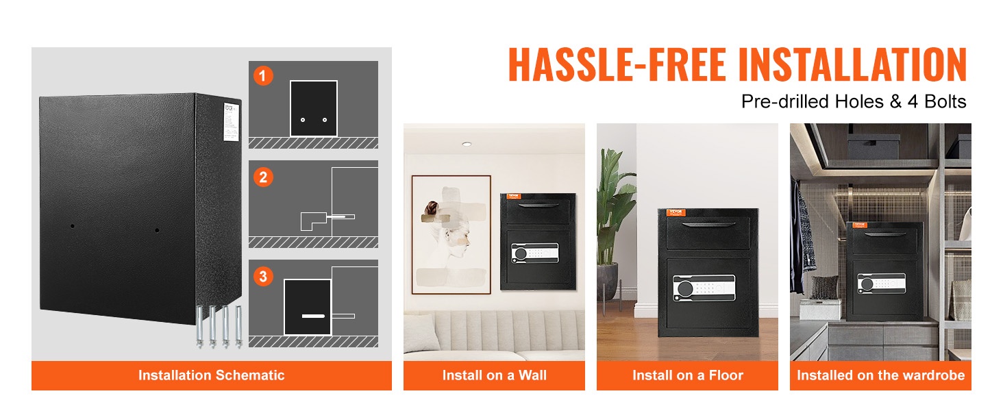 Asennus on nopea. Runkoon on valmiiksi porattu 2 kiinnitysreikää, joiden avulla kassakaapin voi ruuvata tukevasti paikoilleen muutamassa minuutissa.
