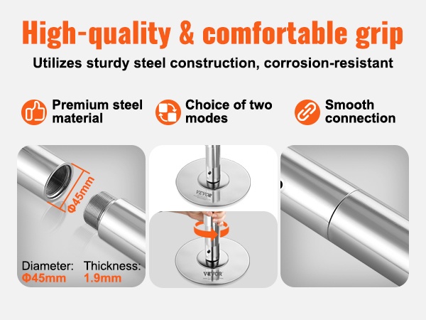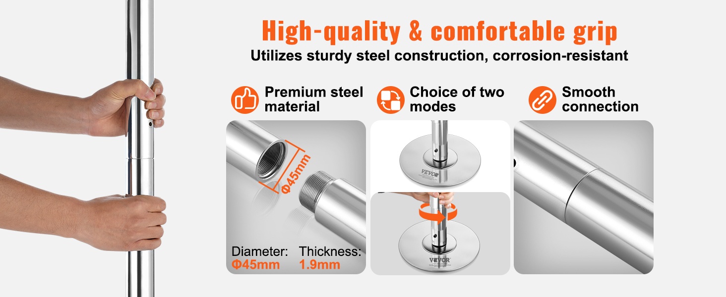 Tämä siirrettävä tankotanssitanko on valmistettu vakiokokoisesta 40mm terästangosta. Pulverimaalattu pinta tuntuu miellyttävältä kädessä ja on ruostetta ja korroosiota kestävä, mikä lisää turvallisuutta ja pitkäikäisyyttä. Suurin kuormituskyky: 200kg / 441lbs.