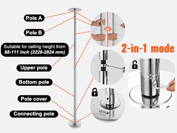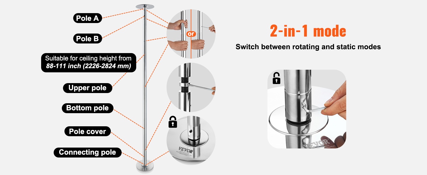 Tanko on purettavissa ja siirrettävissä, ja siirtyminen pyörivän ja staattisen tilan välillä on sujuvaa. Asennus on nopea, ilman jumittumista, ja rakenne pysyy tukevana ja turvallisena. Vahva terästanko on helppo kiivetä ylös ja alas, eikä kattoon tarvitse kiinteitä kiinnityksiä. Mukana tulee asennusohje.