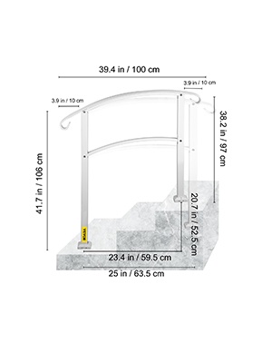 Kaide on mitoitettu 1–2 portaalle, ja se kattaa enintään 2 porrasnousua. Tolppien välinen etäisyys on 11.8"/30 cm, mikä tarjoaa tukevan ja turvallisen otteen portaissa kulkemiseen.