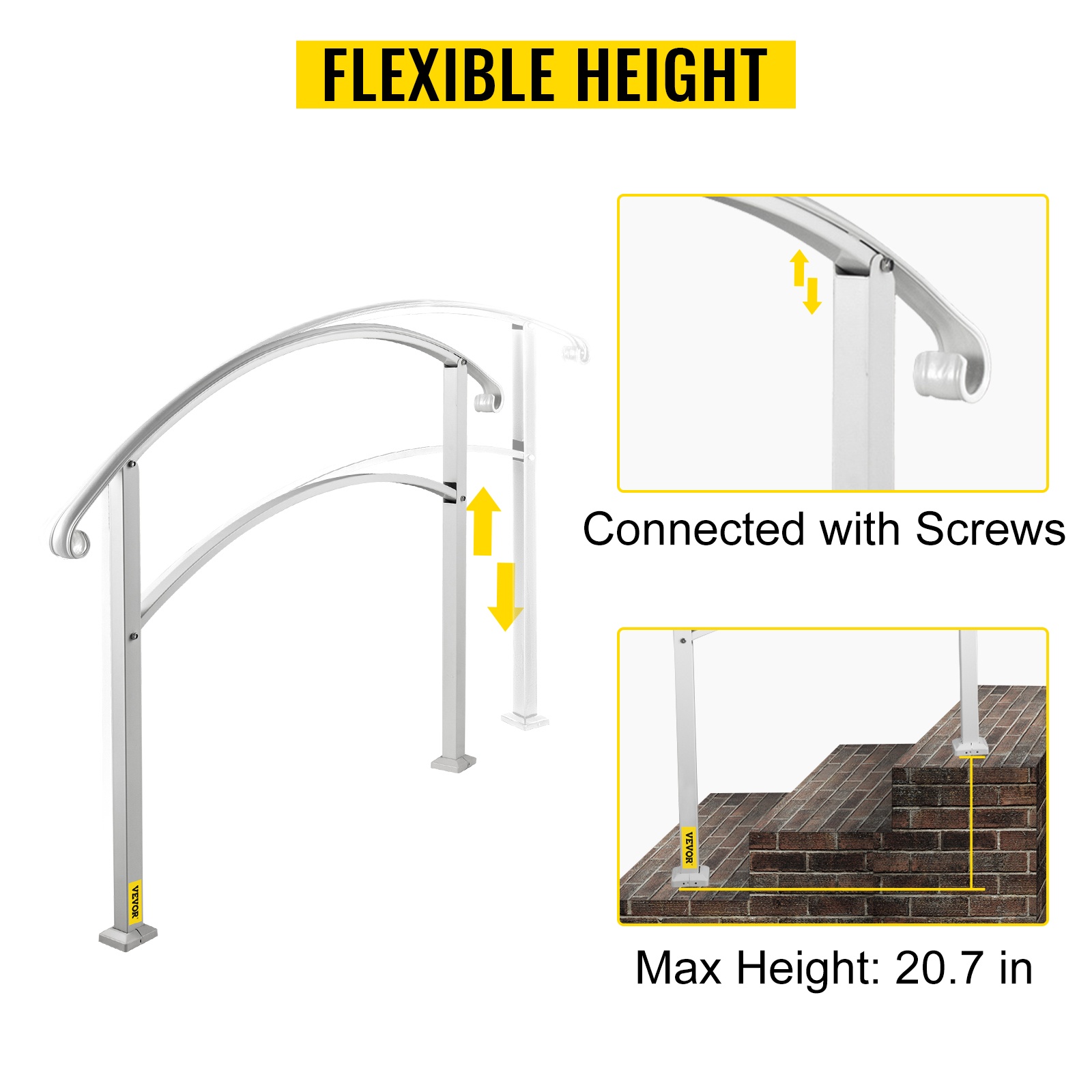 Ruuviliitosten ansiosta kaiteen kallistusta voidaan säätää eri korkuisille portaille sopivaksi. Suurin askelkorkeus on 6.8"/17.3 cm, joten kaide soveltuu tavallisille matalille ulkoportaille.
