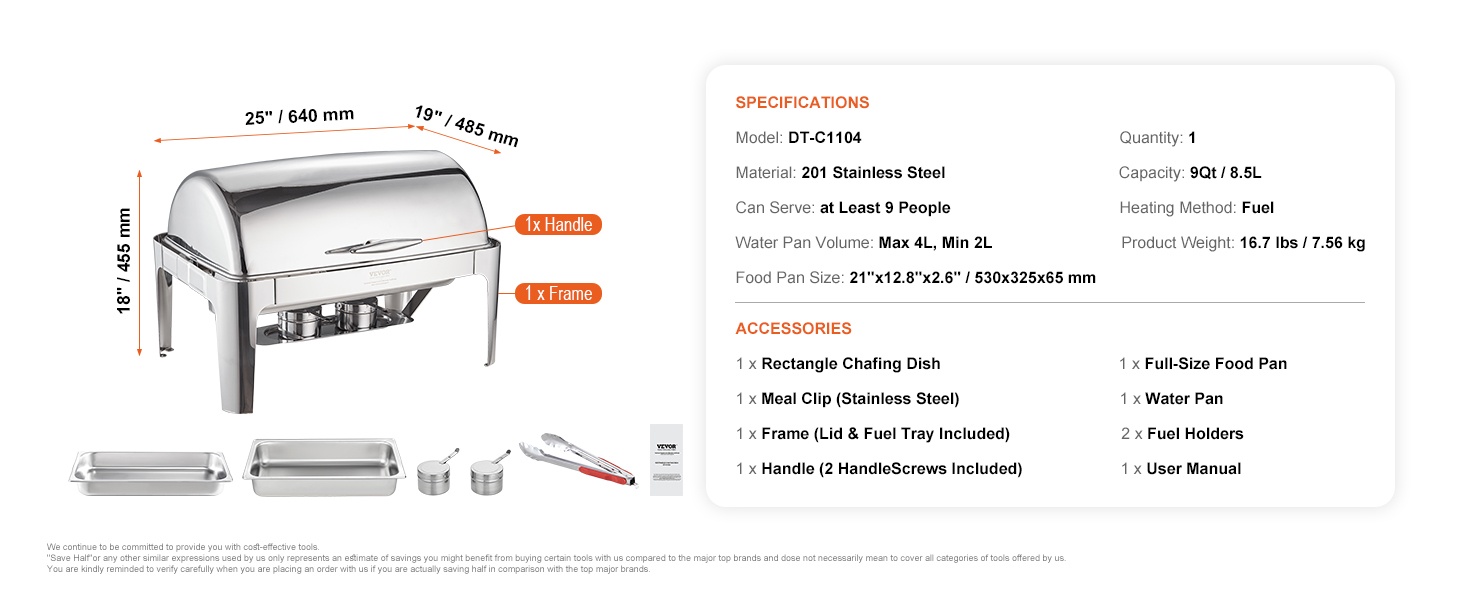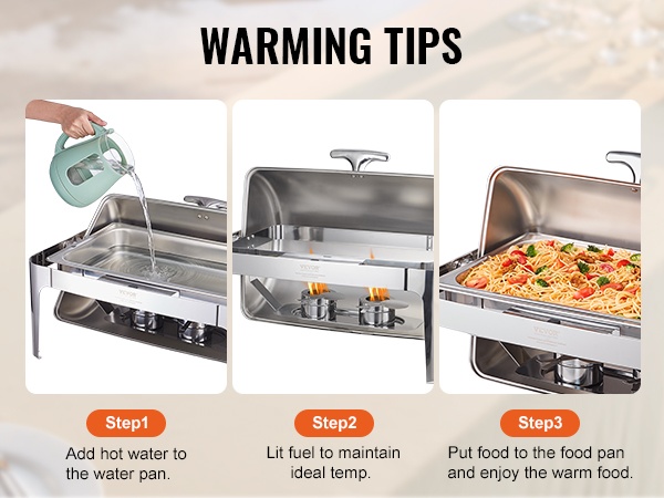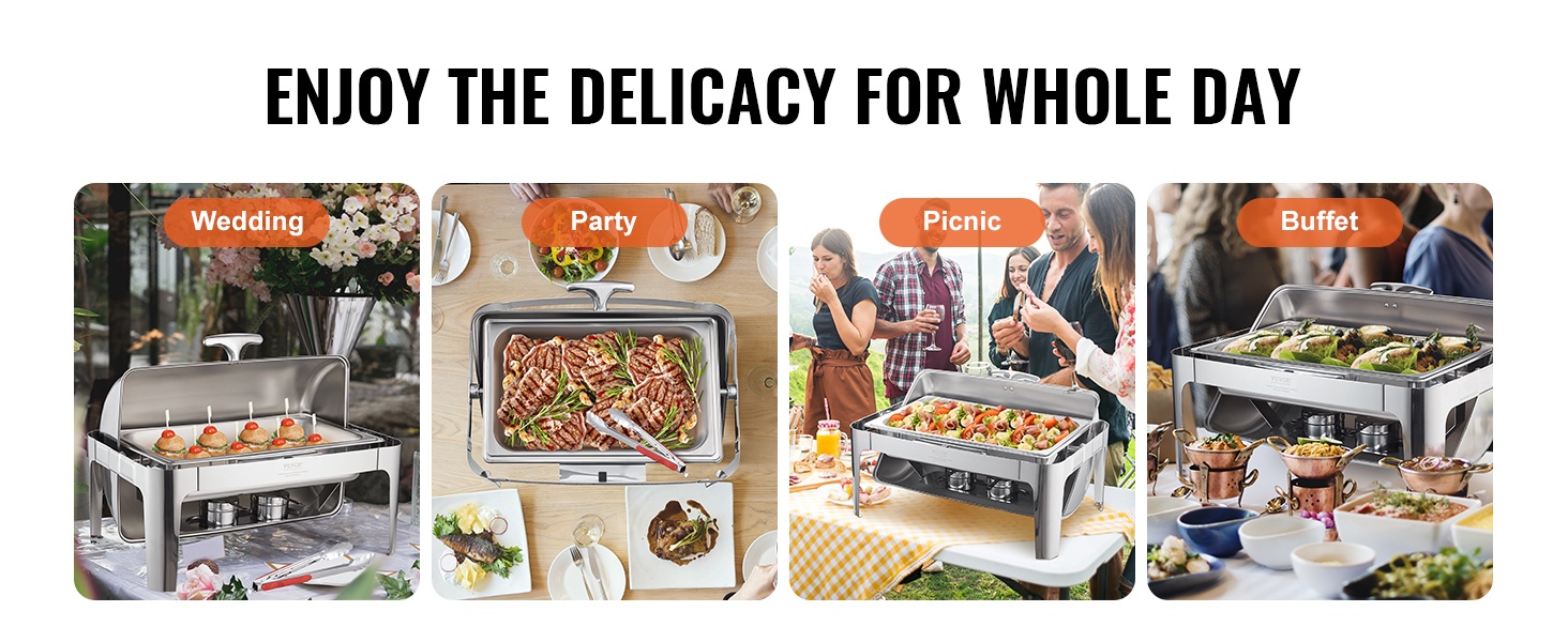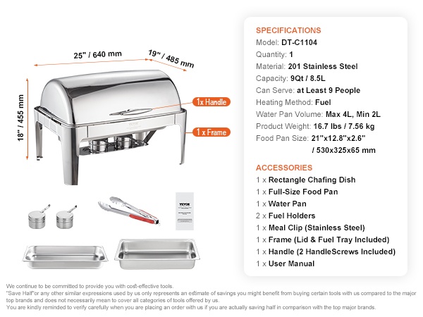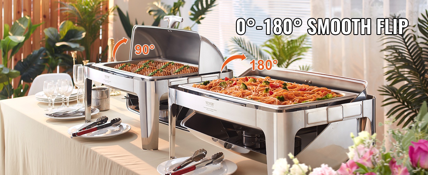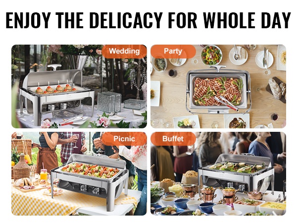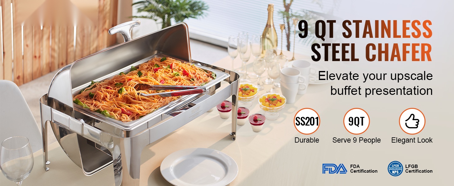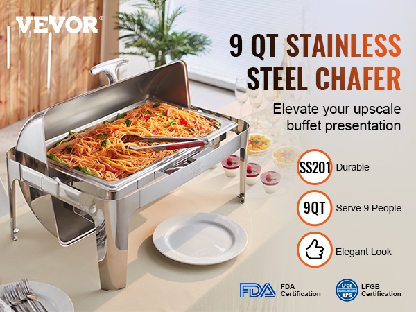 Tyylikäs 8Qt tarjoilulämmitin rullikannella, 201-ruostumatonta terästä, 7.5L, vesiallas 2-4L, polttoainelämmitteinen, helppo puhdistaa, kansi 0-180°, riittää vähintään 8:lle, buffet-pöytiin, pitopalveluun, juhliin, kokouksiin ja paino 7.56 kg.