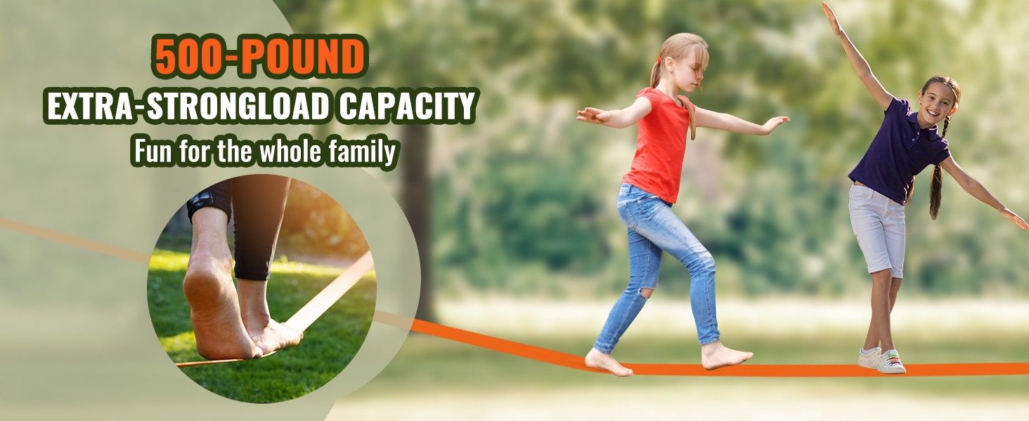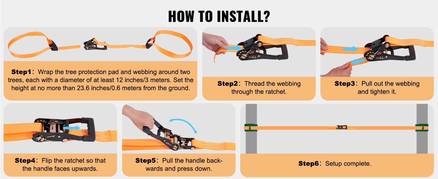 - Slackline-pituus: 60 ft / 18.3 m – sopii useimpiin pihoihin ja puistoihin