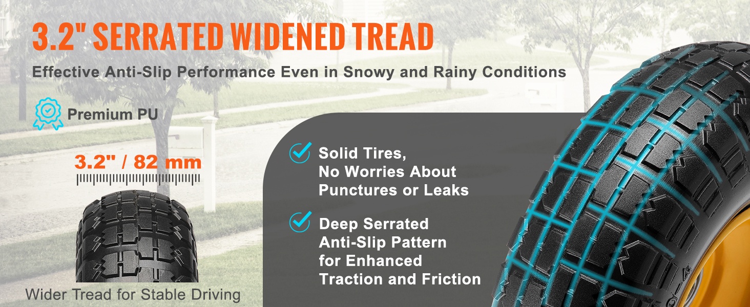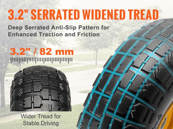 Leveä 2.5" / 64 mm kulutuspinta ja syvät kuvioinnit takaavat hyvän pidon nurmikolla, soralla ja lumisilla pinnoilla. Pyörät rullaavat tasaisesti ja vähentävät liukastumisriskiä myös epätasaisessa maastossa.
