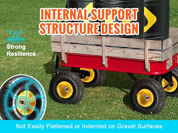 Älykkään sisäisen tukirakenteen ansiosta täyskumiset PU-renkaat säilyttävät muotonsa myös pitkän paikallaanolon ja karkean alustan jälkeen. Renkaat eivät tyhjene, eivätkä painu pysyvästi kasaan.