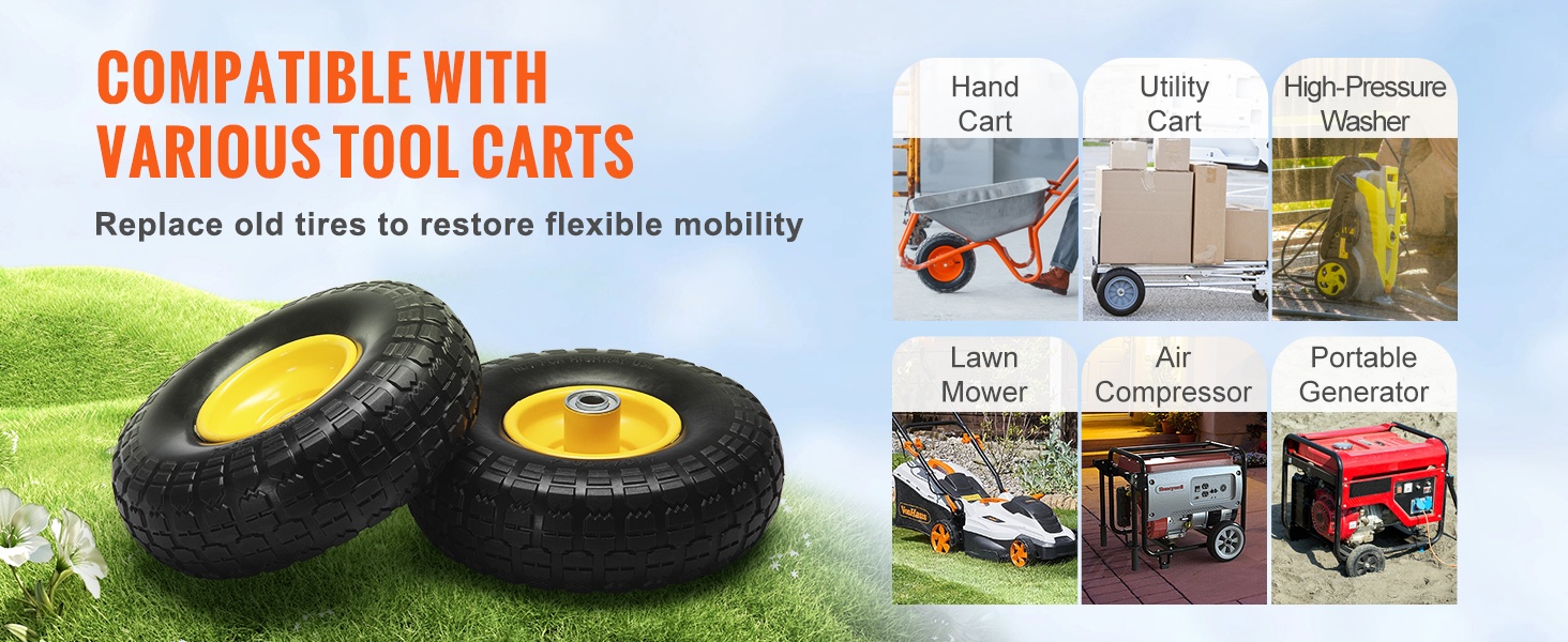 Nämä 10" / 254 mm läpimittaiset, puhkeamattomat pyörät soveltuvat esimerkiksi nokkakärryihin, kuljetus- ja varastokärryihin, puutarhaperiin, kottikärryihin, pieniin traktoreihin, generaattoreihin ja lumilinkoihin.