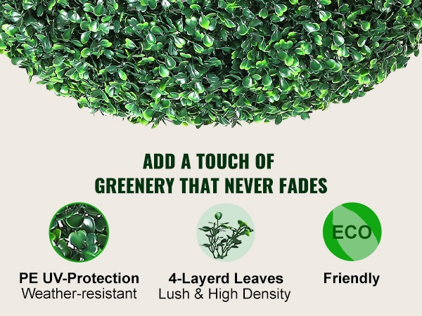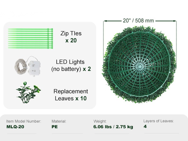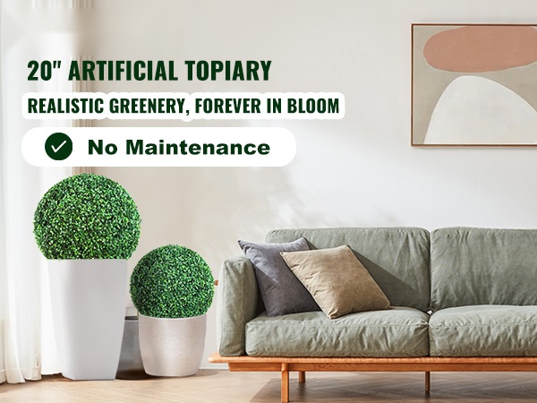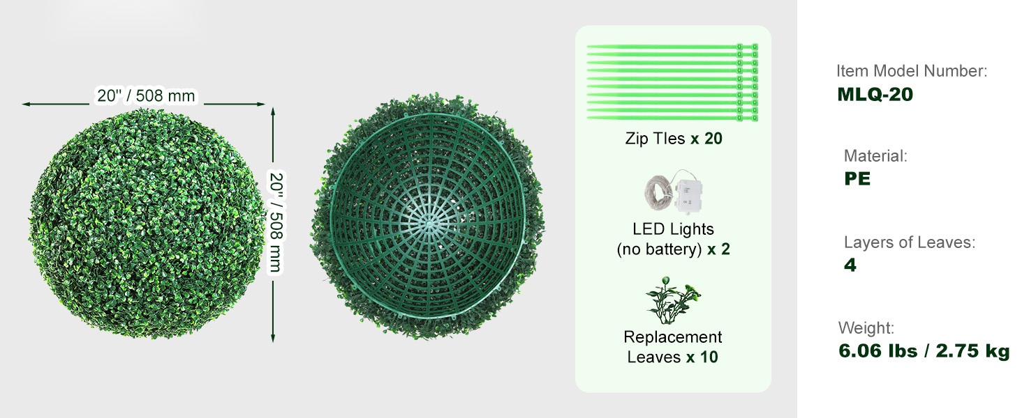 Tämä 50.8 cm korkea, pallon muotoinen tekopuksipuu tuo vihreyttä kotiin, parvekkeelle, puutarhaan tai juhlatilaisuuksiin ilman kastelua tai leikkaamista. Aidonnäköinen lehdistö ja tukeva rakenne tekevät siitä helppohoitoisen sisä- ja ulkokoristeen ympäri vuoden.