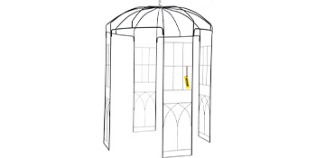 Teräksinen lintuhäkin muotoinen huvimaja korkeus 2,4 metriä leveys 2 metriä