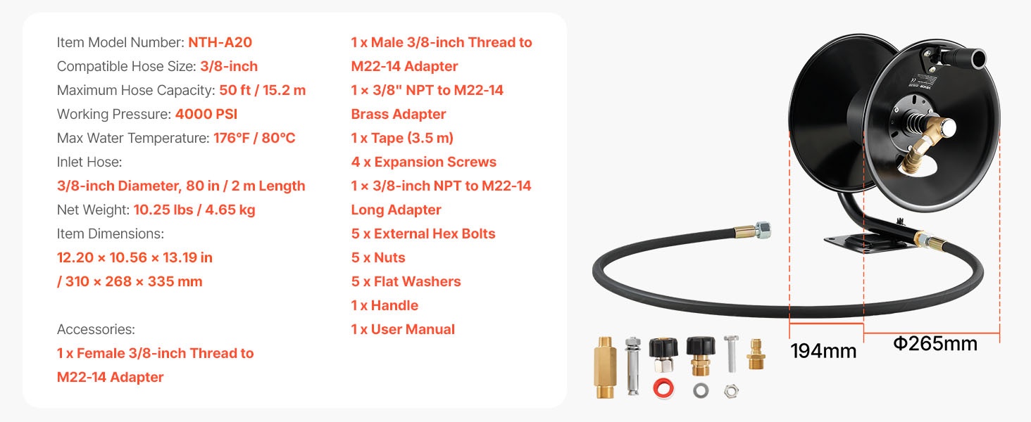- Letkun koko kelalla (reel hose): 1/4-tuumainen halkaisija, pituus 65 ft / 19.8 m, ulkohalkaisija 11.5 mm