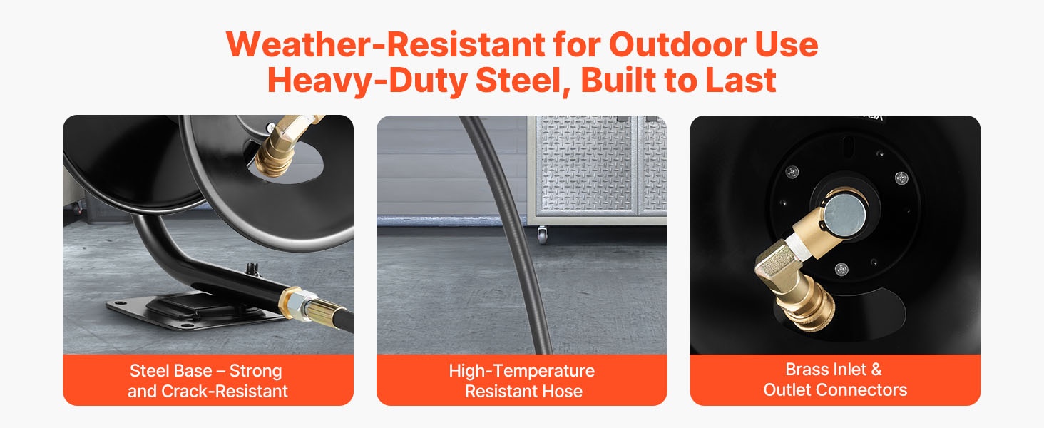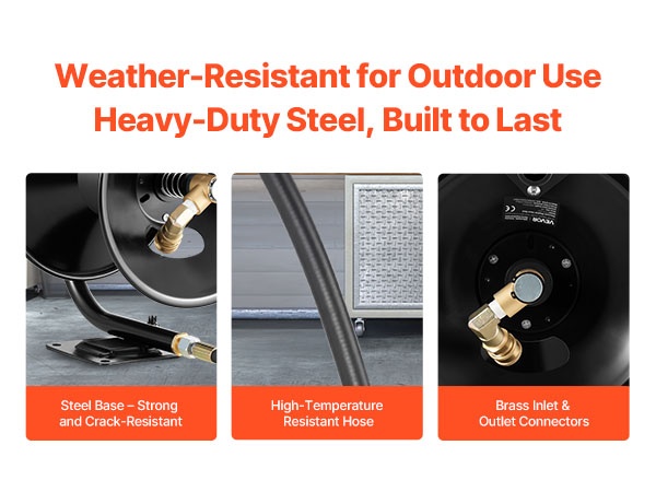 Kela on valmistettu tukevasta teräksestä, ja letku kestää hyvin kuumuutta. Sisääntulo- ja ulostuloliittimet ovat messinkiä, mikä parantaa tiiviyttä ja käyttöikää. Vahvistettu teräspohja kestää ulkokäytön ja vähentää perinteisten letkukelojen tyypillisiä kestävyysongelmia.