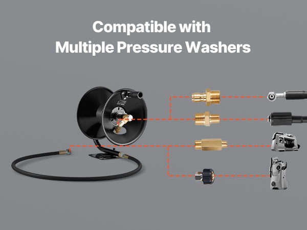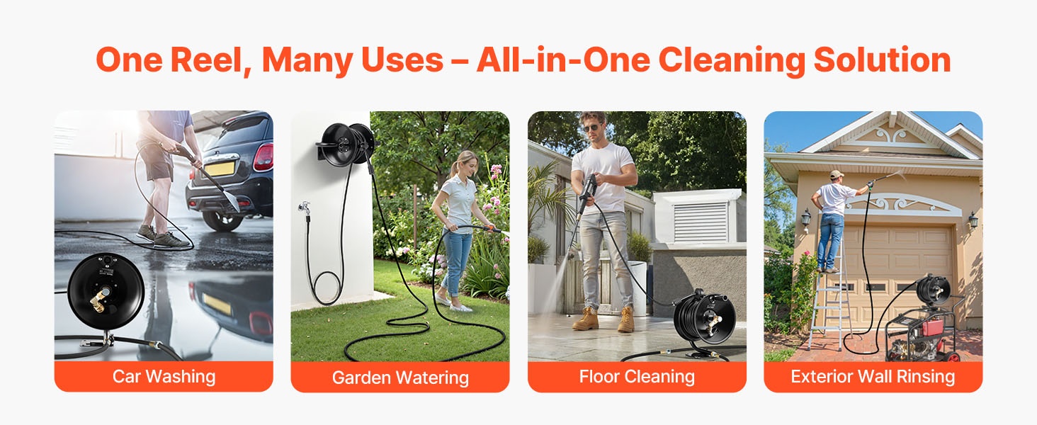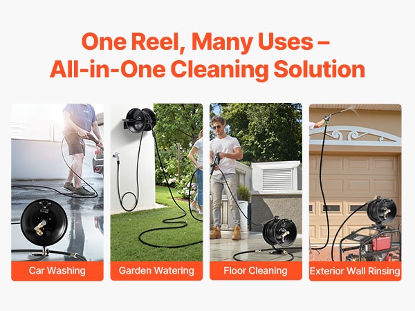 Tämä letkukela säilyttää painepesurin letkun siististi ja estää sotkeentumisen. Se sopii painepesureiden kanssa käytettäväksi esimerkiksi auton pesuun, kodin yleispesuun ja puutarhan kasteluun. Helppo käsitellä ja auttaa pitämään siivous- ja kastelutyöt järjestyksessä.