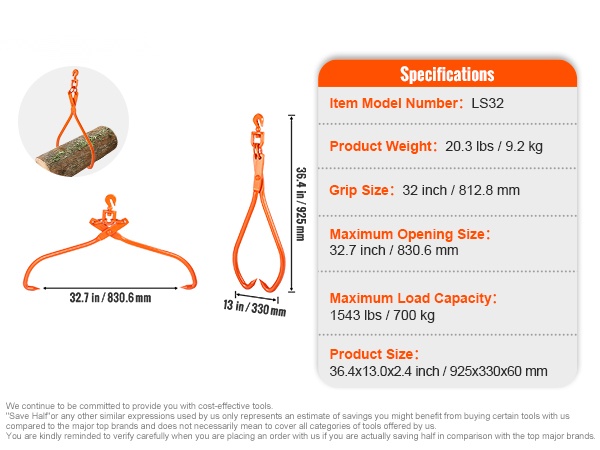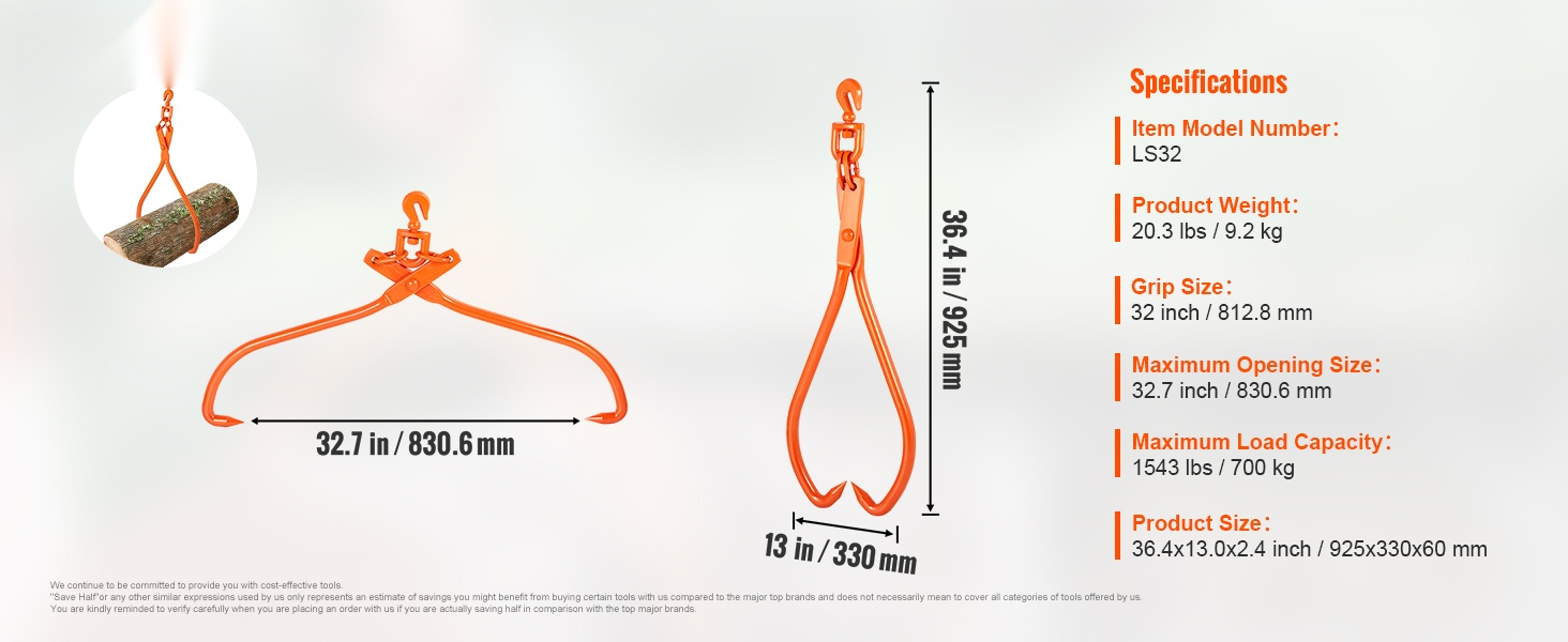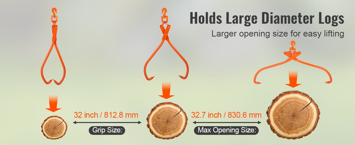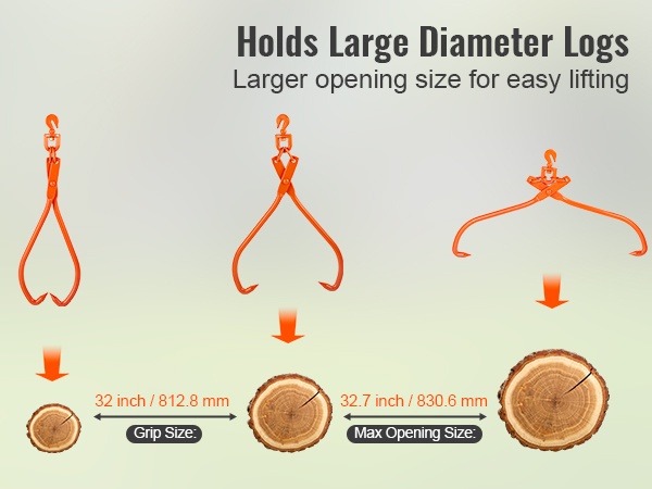 Maksimiavauma on 20 inch ja tartuntakoko 18 inch, joten kahmarit sopivat monenlaisten suurten runkojen käsittelyyn. Niitä voi käyttää myös esimerkiksi heinäpaalien, kaapeleiden, kivien ja muiden raskaiden kappaleiden siirtämiseen.