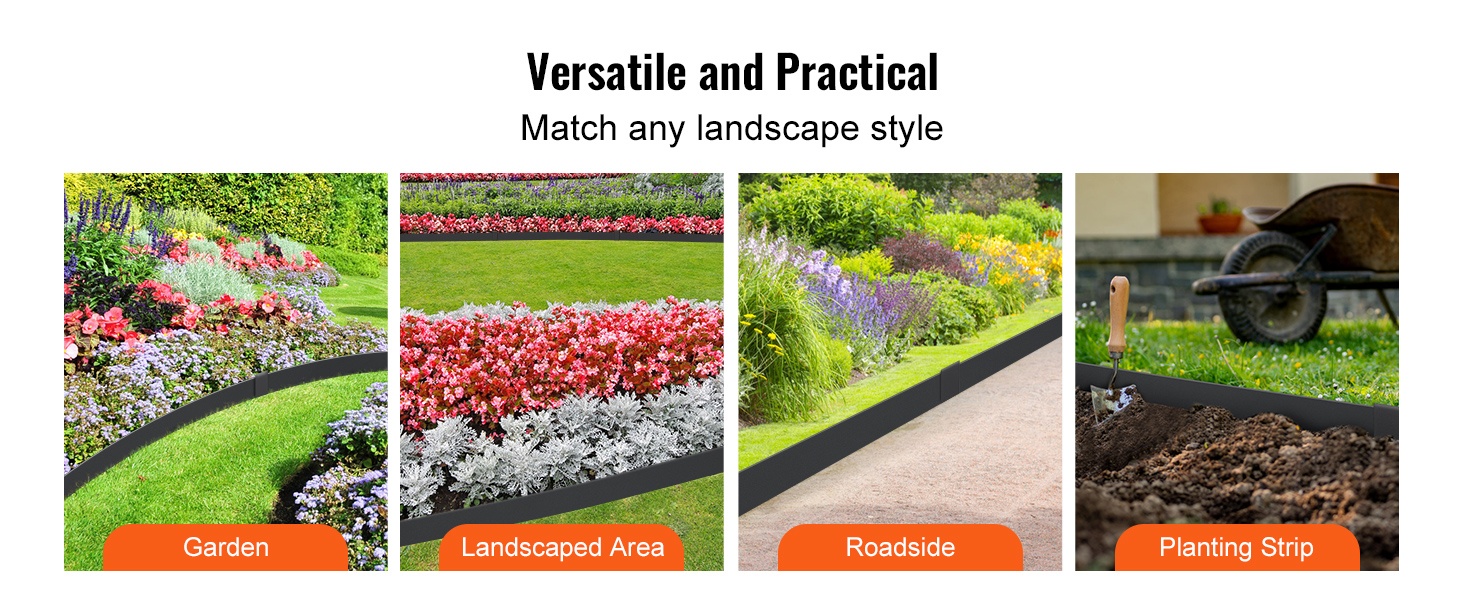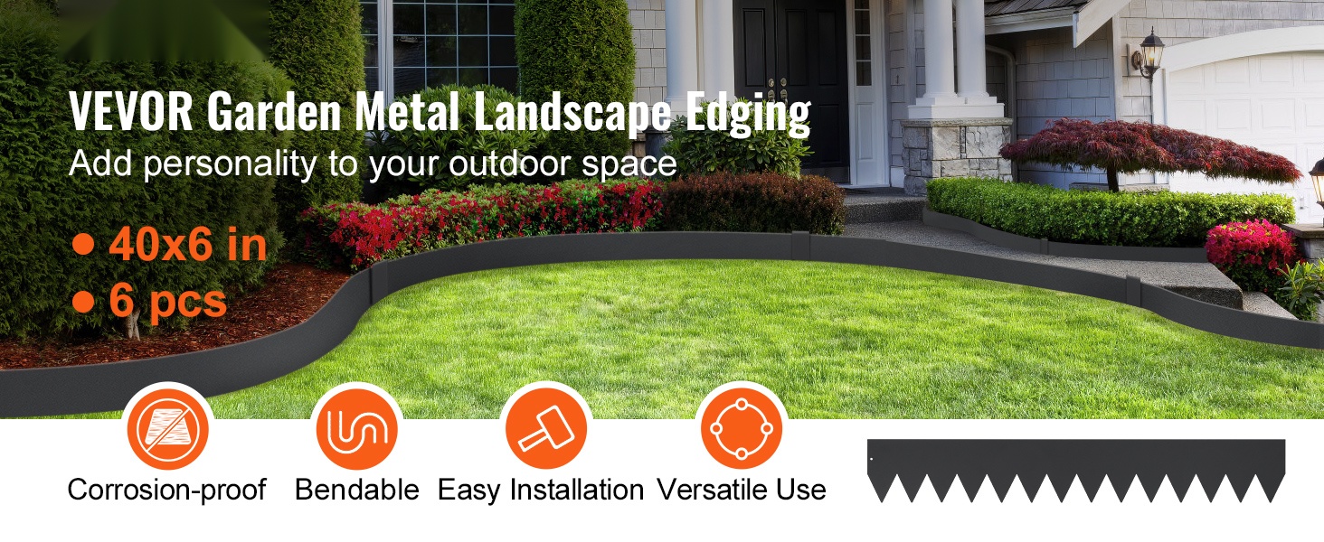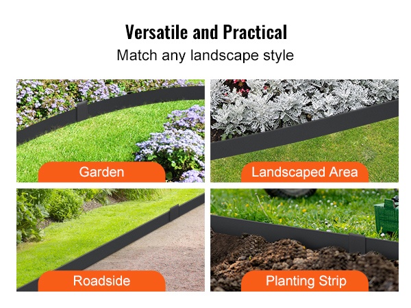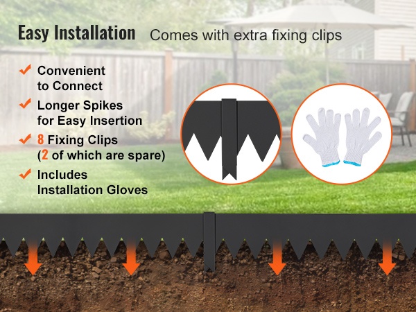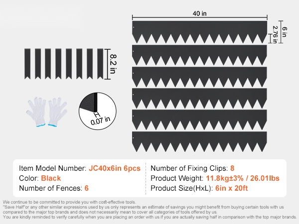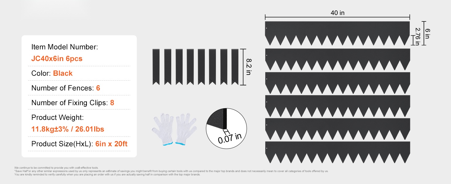 Pakkaukseen sisältyy 6 kpl reunalistoja, 8 kiinnikettä ja yksi pari asennuskäsineitä. Jokaisen listan mitat ovat noin 40 x 6 tuumaa (noin 101.6 x 15.2 cm). Pidennetty kiila helpottaa listojen kiinnittämistä maahan ja auttaa pitämään reunan tukevasti paikoillaan. Reuna auttaa myös rajaamaan rikkaruohojen leviämistä ja tekee puutarhasta huolitellun näköisen.