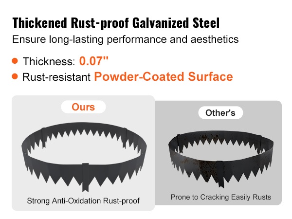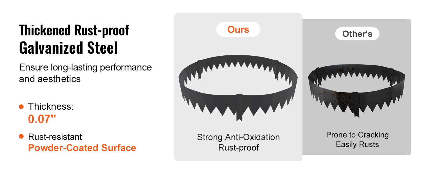 Reuna on valmistettu 0.07" paksusta, sinkitystä teräksestä, joka kestää haalistumista, halkeilua ja ruostumista. Materiaali soveltuu ympärivuotiseen ulkokäyttöön ja kestää hyvin kosteaa ja mutaista maata.