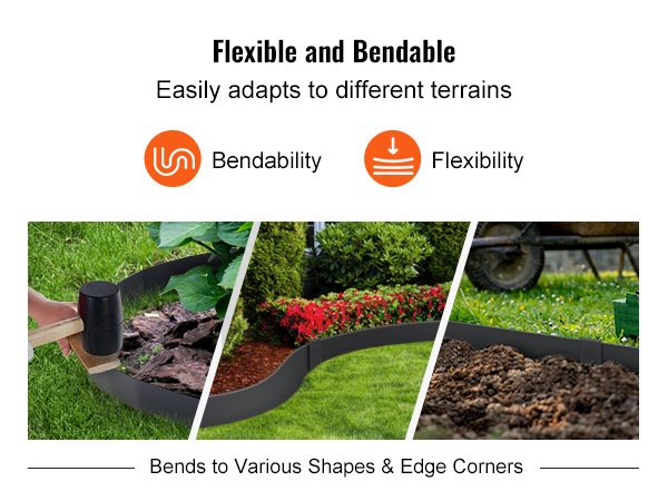Taipuisa rakenne mahdollistaa sekä suorat linjat että kaaret. Taivuta reunalista haluttuun kulmaan, paina ja lyö se maahan vasaralla ja yhdistä osat mukana tulevilla kiinnikkeillä. Asennus onnistuu ilman monimutkaisia työkaluja tai ammattilaisen apua.