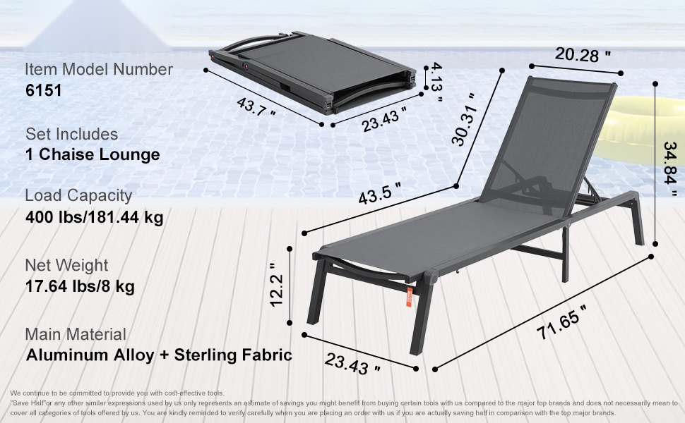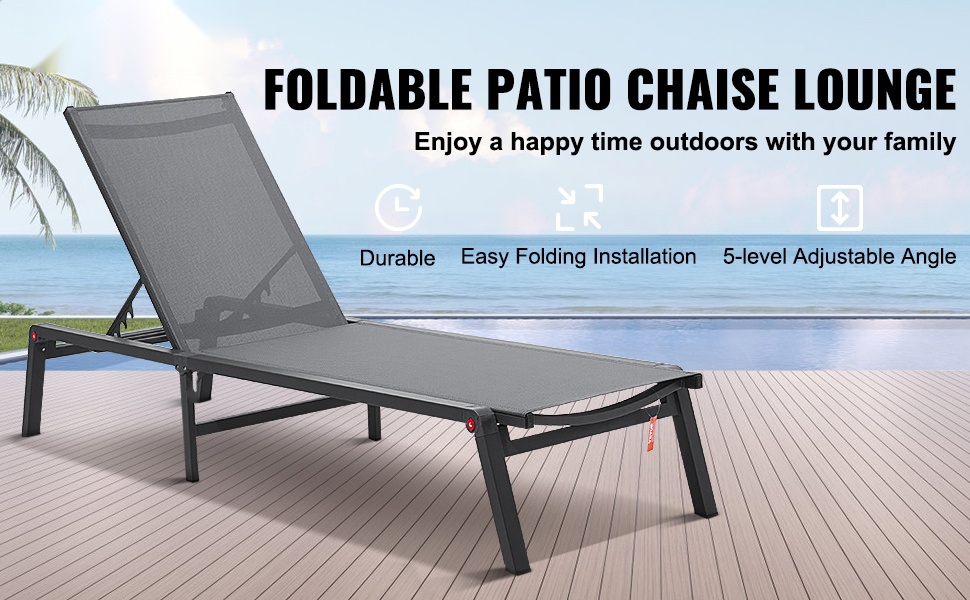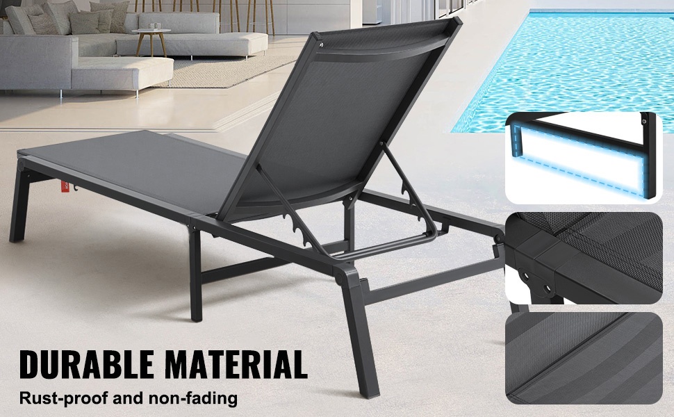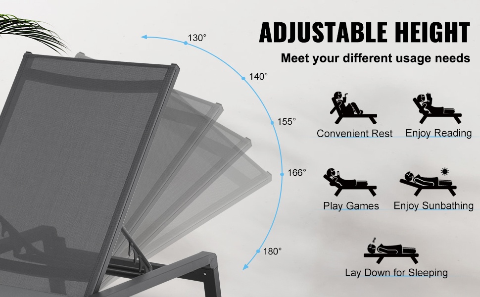 Säädettävä selkänoja tarjoaa 5 eri asentoa, jotta löydät sopivan asennon lukemiseen, lepäämiseen tai auringonottoon. Tuolit voidaan myös laskea täysin vaakatasoon mukavaa makuuasentoa varten.