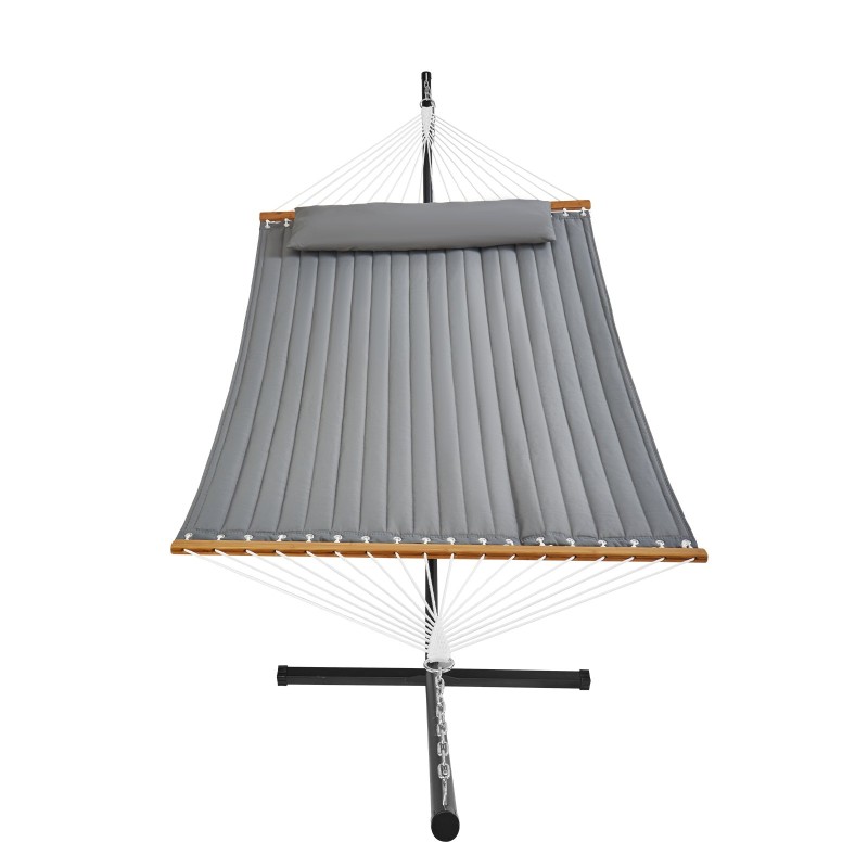Kaksoistikattu kangasriippumatto jalustalla on suunniteltu pitkäaikaiseen ulkokäyttöön. 200 g tikattu puuvillakangas, vahvistetut päät, vakaa teräsjalusta, kovapuinen poikkipuu ja käsin punotut köydet muodostavat yhdistelmän, joka tarjoaa mukavuutta ja luotettavuutta monenlaisiin ulkotiloihin.