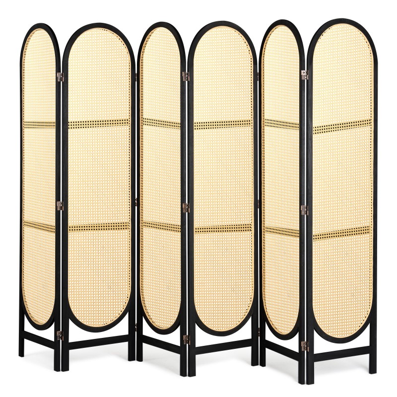Tämä 6-paneelinen käsinkudottu tilanjakaja yhdistää yksityisyyden ja sisustuksellisuuden. Massiivipuinen runko ja rottinkisomisteinen punos tuovat tilaan lämmintä, hieman vintage-henkistä tyyliä ja auttavat jakamaan huoneen eri toimintoihin.
