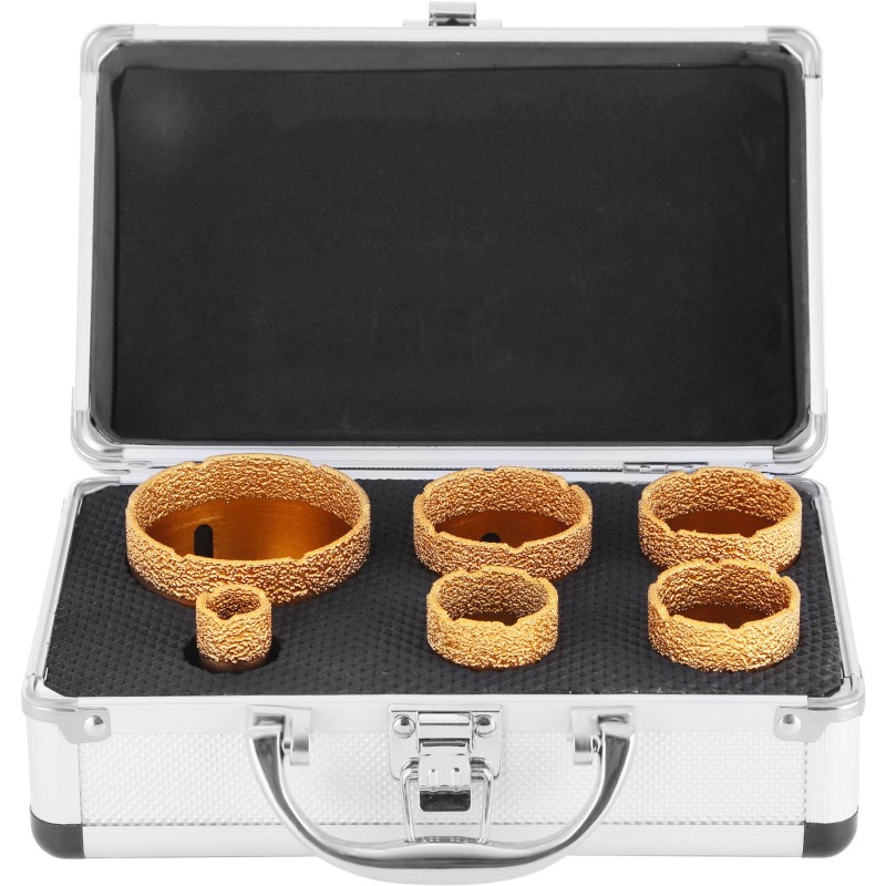6-osainen timanttireikäsahasarja keraamisille laatoille, marmorille ja muille koville materiaaleille. Sarja sisältää timanttipäällysteiset reikäsahat, jotka tekevät nopeita, siistejä ja tarkkoja reikiä ilman veden käyttöä, joten työskentelyalue pysyy helpommin siistinä.