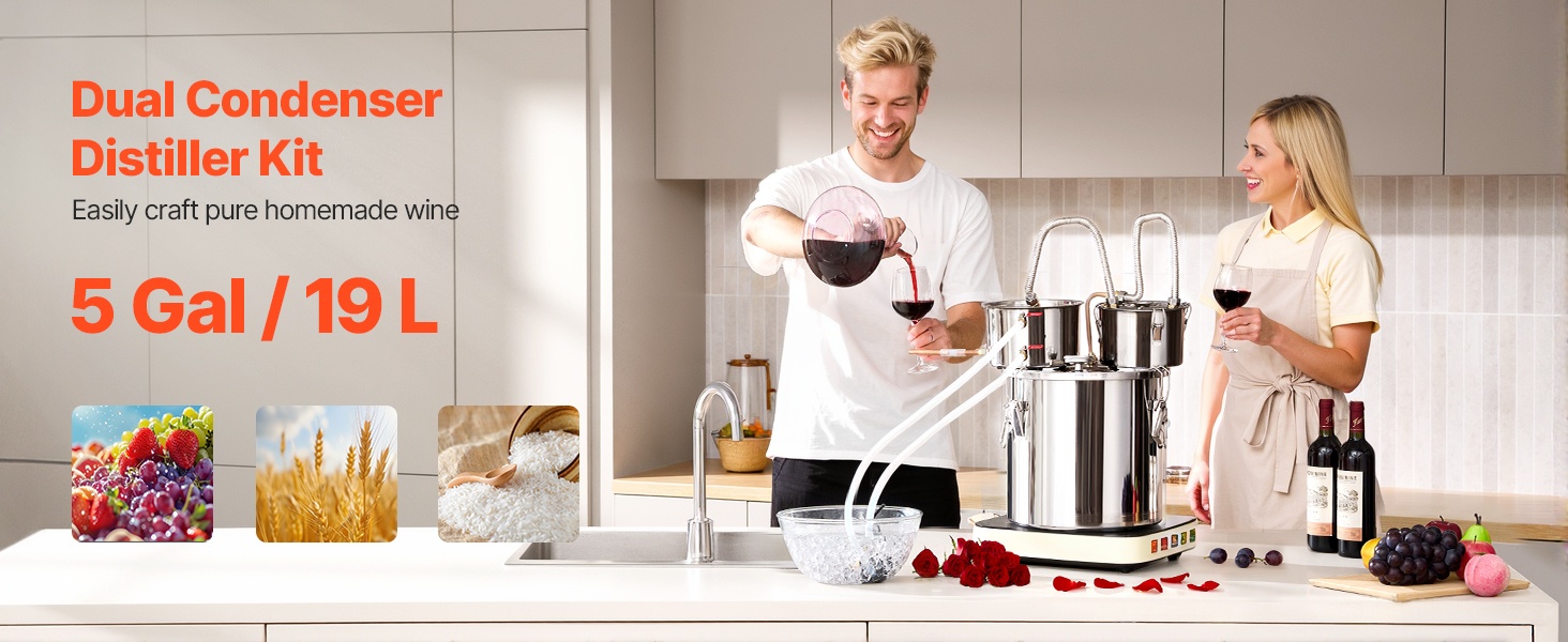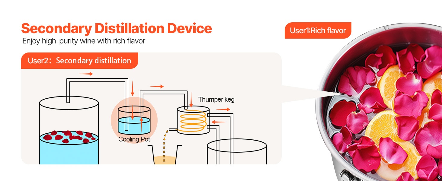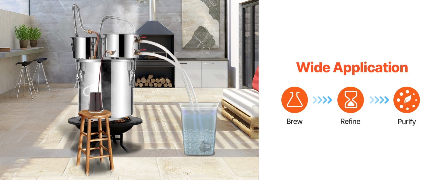 - Kaksinkertainen jäähdytin ja väliastia toissijaiseen tislaukseen paremman puhtauden ja maun saavuttamiseksi.