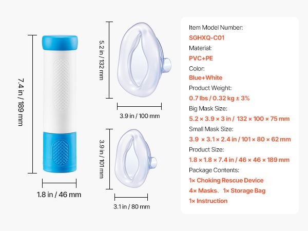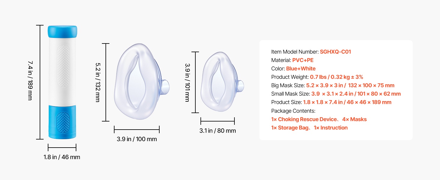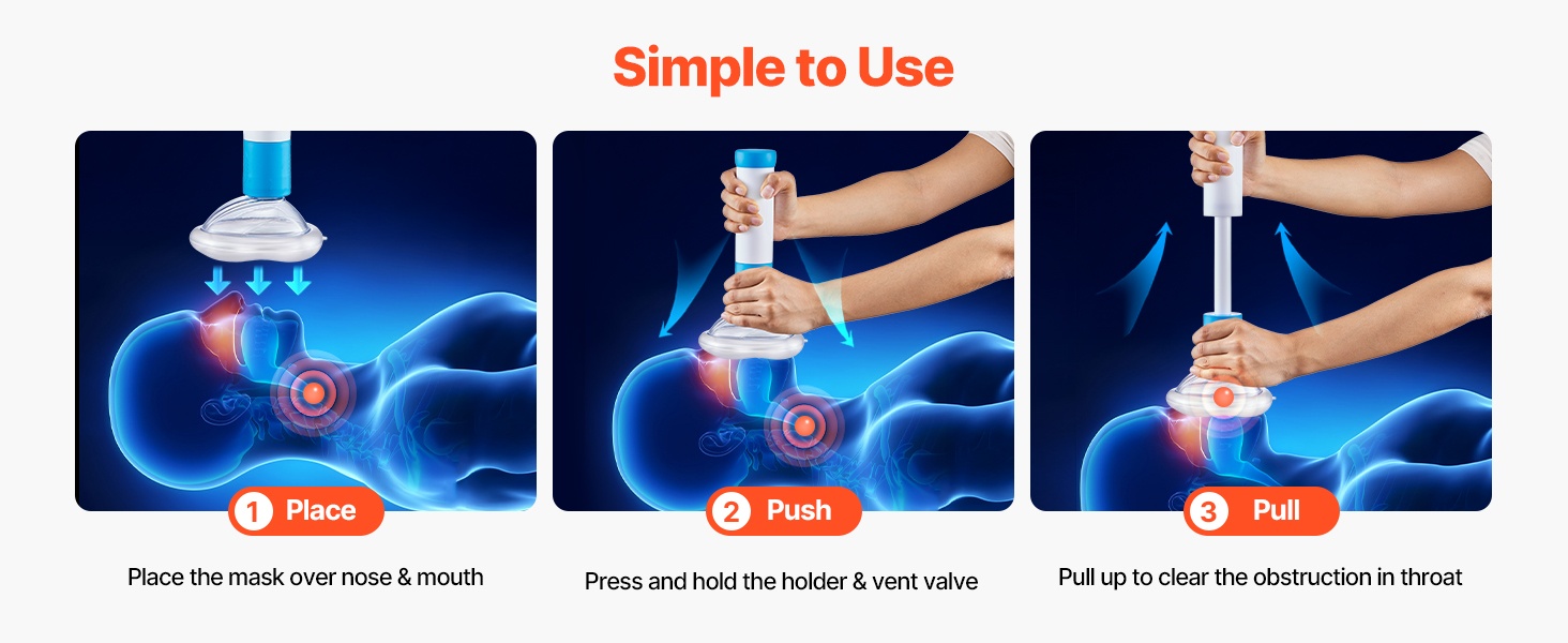 Tämä tukehtumisapulaite on helppokäyttöinen ja voimakkaan imutehon ansiosta suunniteltu poistamaan hengitysteitä tukkivia esineitä. Laite on valmistettu PVC+PE-materiaalista ja on kevyt sekä helposti mukana kuljetettava – soveltuu arkeen kotiin, kouluun, toimistoon ja matkalle.