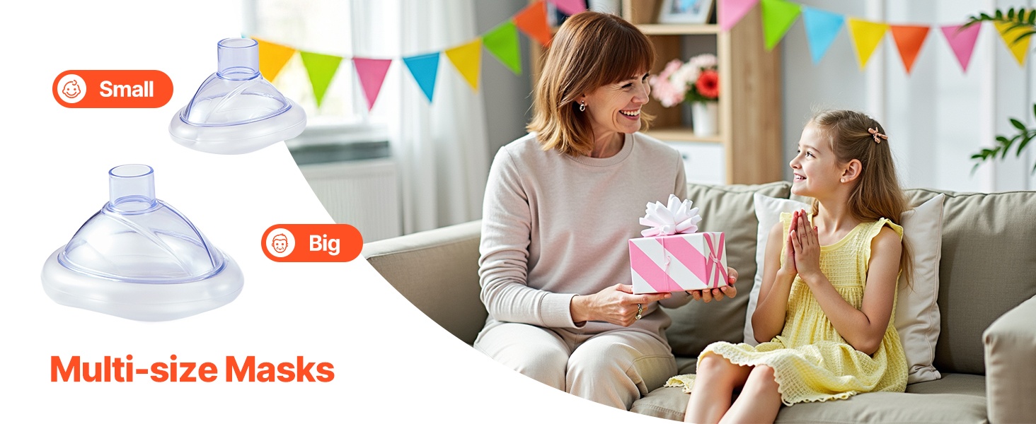 Pakettiin kuuluu 2 erikokoista maskia, jotka sopivat monenikäisille käyttäjille. Maskit asettuvat tiiviisti kasvoille, mikä parantaa tyhjiön muodostumista ja laitteen tehoa.