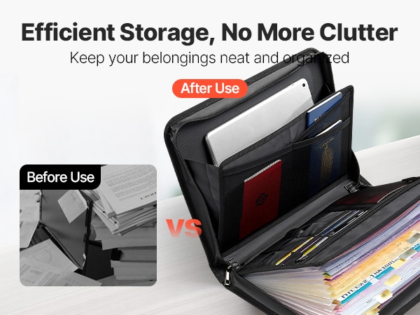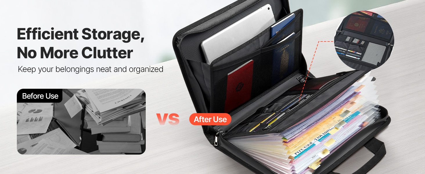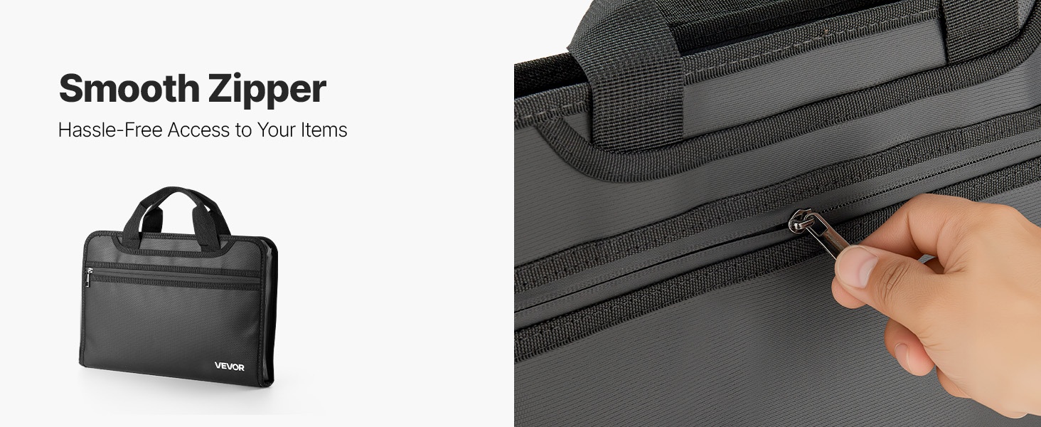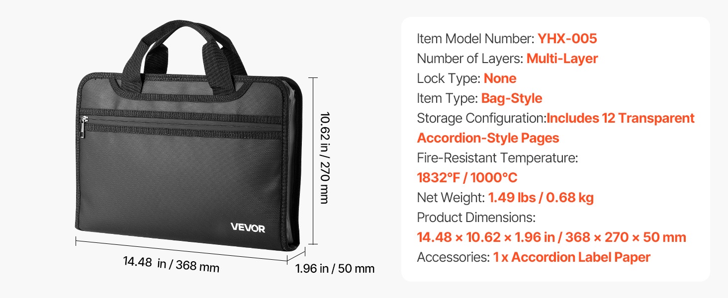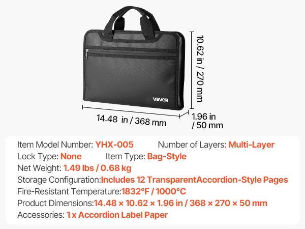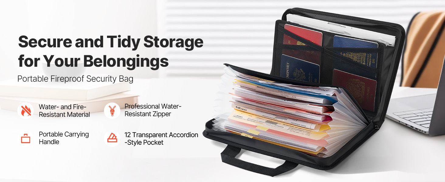 Tulenkestävä ja vedenpitävä asiakirjalaukku suojaa tärkeitä papereita ja elektroniikkaa jopa 1000°C lämpötilassa. Monikerroksinen rakenne ja 12-osainen haitaritasku helpottavat järjestämistä kotona, toimistossa ja matkalla.