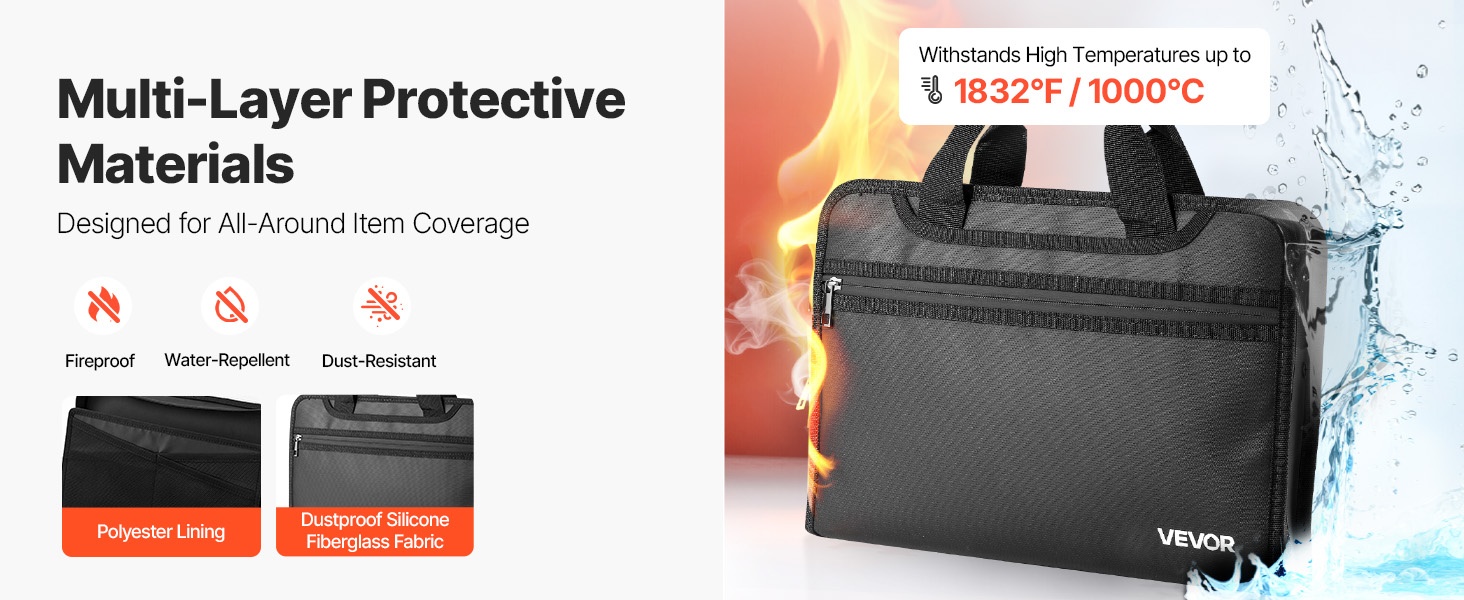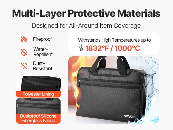 Laukku on valmistettu pölyä hylkivästä silikonipinnoitetusta lasikuitukankaasta, joka kestää jopa 1832°F / 1000°C lämpötilan. Se auttaa pitämään asiakirjat ja laitteet turvassa tulipalon, sateen ja arjen pölyn aikana.