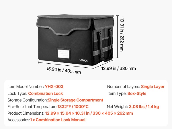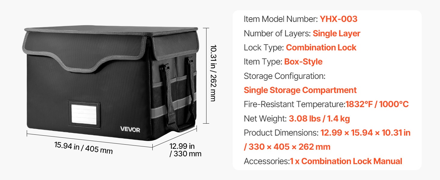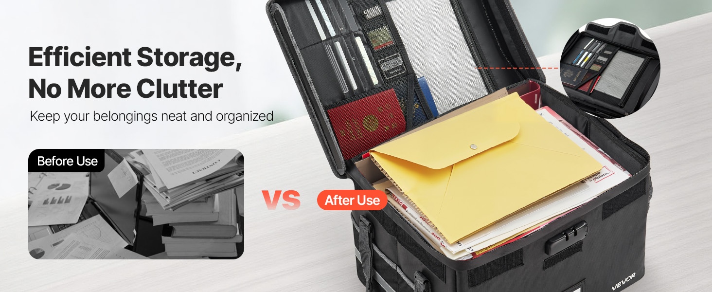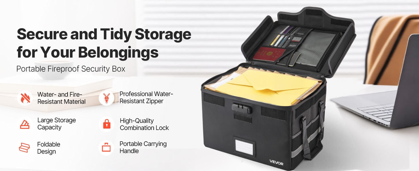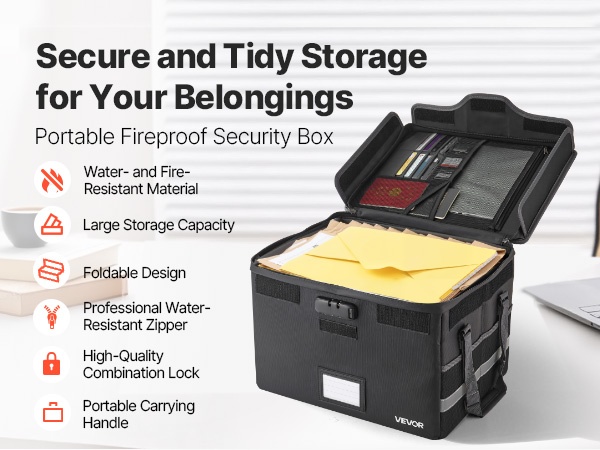 Tulenkestävä ja vedenpitävä asiakirjalaatikko suojaa tärkeitä asiakirjoja, passeja ja arvoesineitä jopa 1832°F / 1000°C lämpötilassa. Laatikko pitää veden ja pölyn loitolla, ja sen pehmeä rakenne suojaa sisältöä kolhuilta. Paino on vain 3.08 lbs / 1.4 kg, joten laatikkoa on helppo kuljettaa kotona, toimistossa tai matkalla.