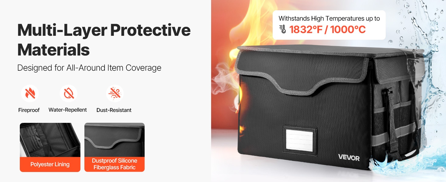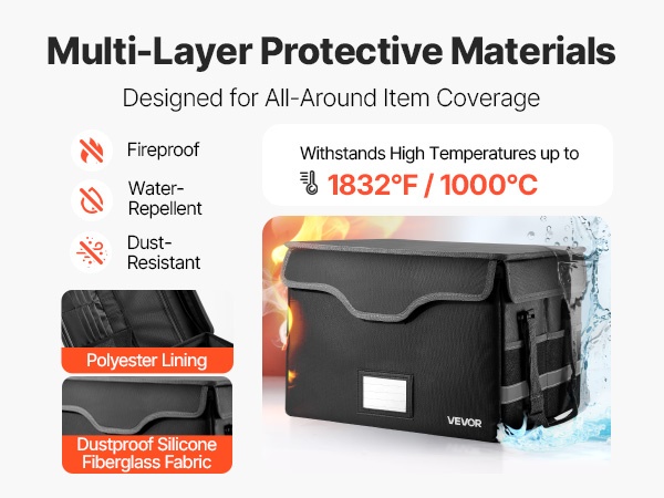 Monikerroksinen silikonipinnoitettu lasikuitukangas ja polyesterivuori auttavat suojaamaan sisältöä tulipalon, sateen ja arjen pölyn varalta. Päivittäiset asiakirjat, elektroniikka ja muut tärkeät tavarat saavat tasaisen suojan ja pysyvät hyvässä järjestyksessä.