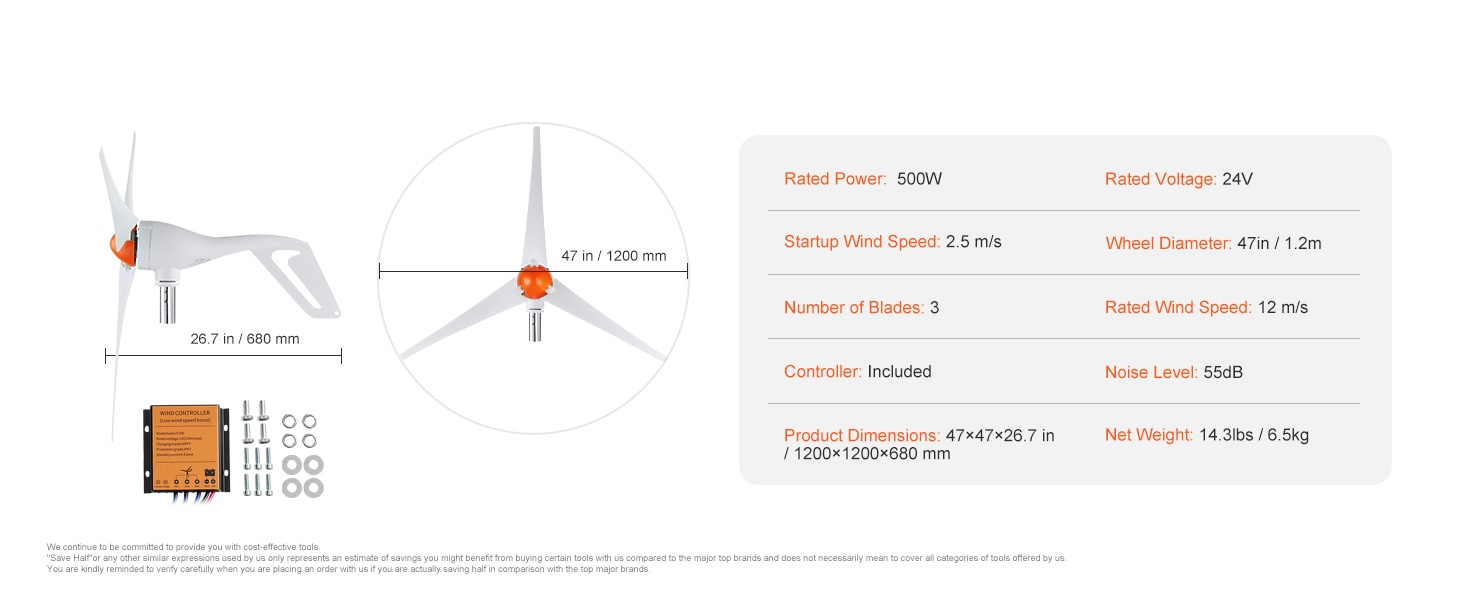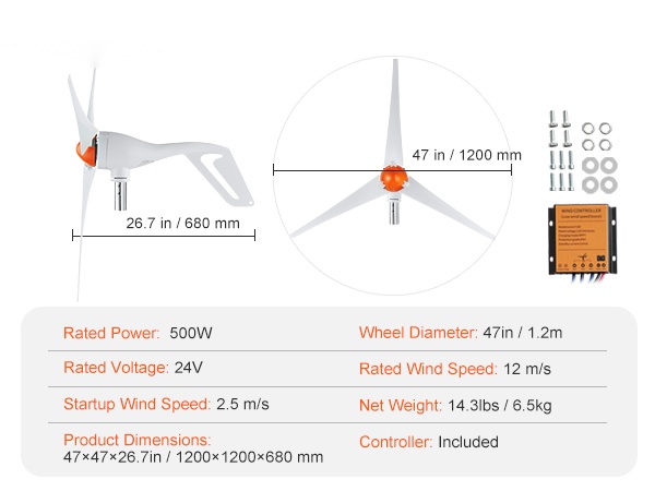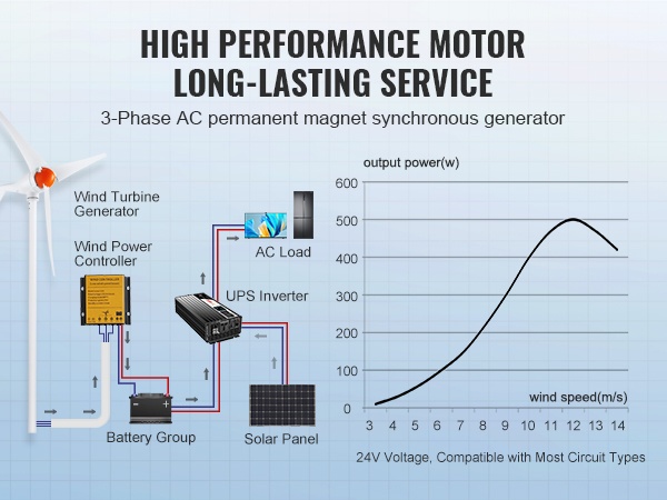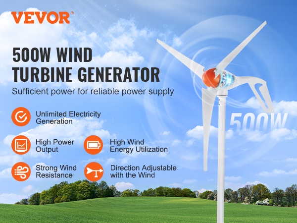 Tämä 500W tuuliturbiinigeneraattori hyödyntää tuulienergiaa tehokkaasti ja luotettavasti. Se soveltuu omakotitaloihin, maatiloille, matkailuautoihin ja veneisiin, ja auttaa pienentämään verkosta ostetun sähkön tarvetta.