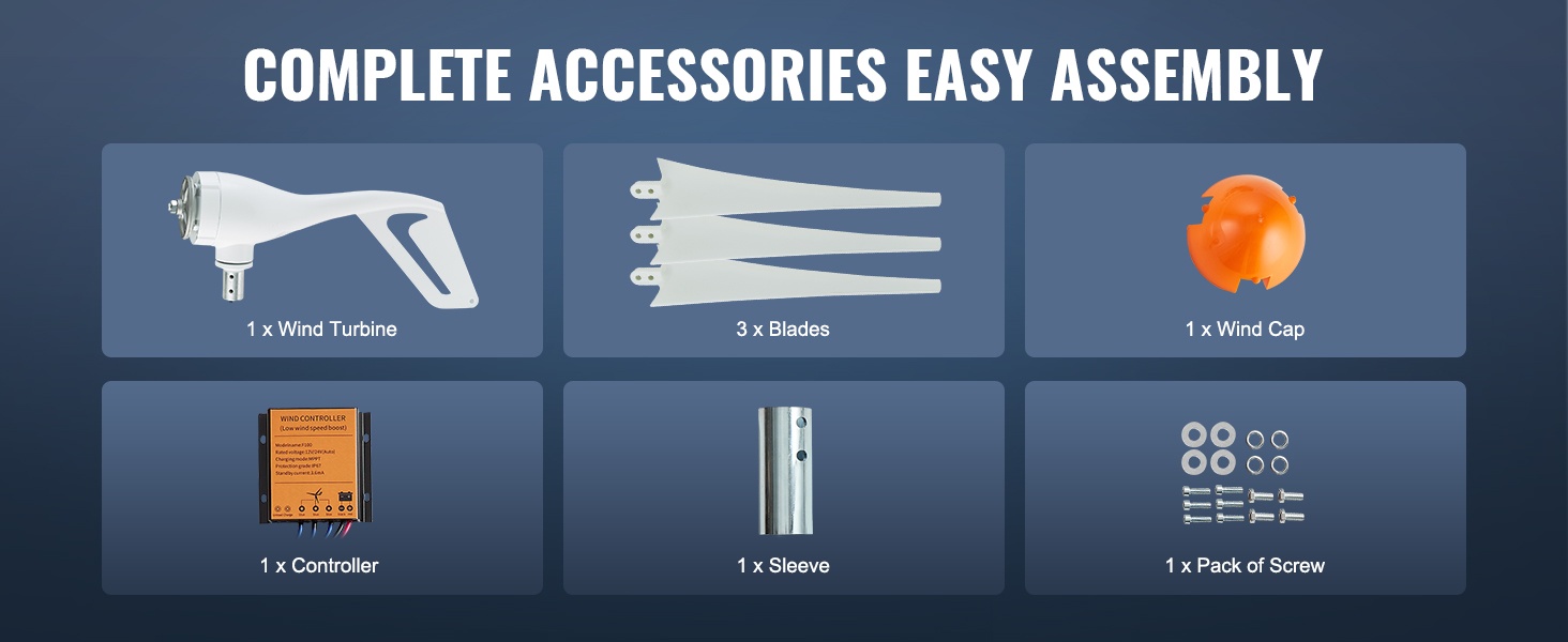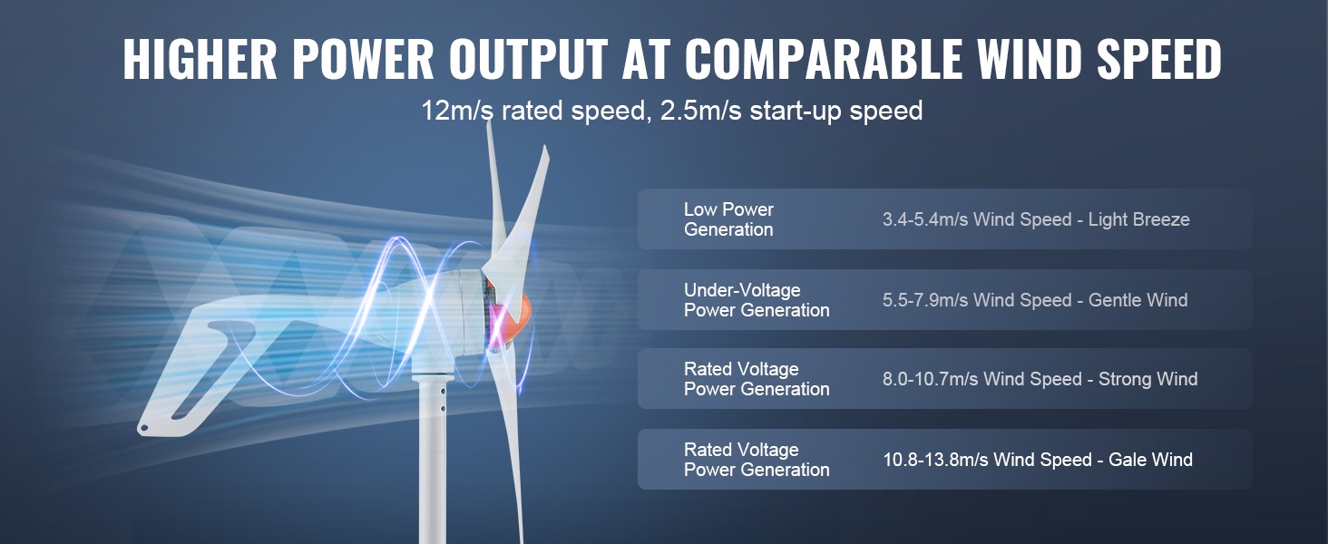 12V tuuligeneraattoripaketti käynnistyy jo, kun tuulen nopeus on 2.5 m/s, ja nimellistuulen nopeus on 12 m/s. Parhaan tehon saavuttamiseksi suositellaan asennusta paikkaan, jossa tuuliolosuhteet ovat hyvät ja tasaiset.