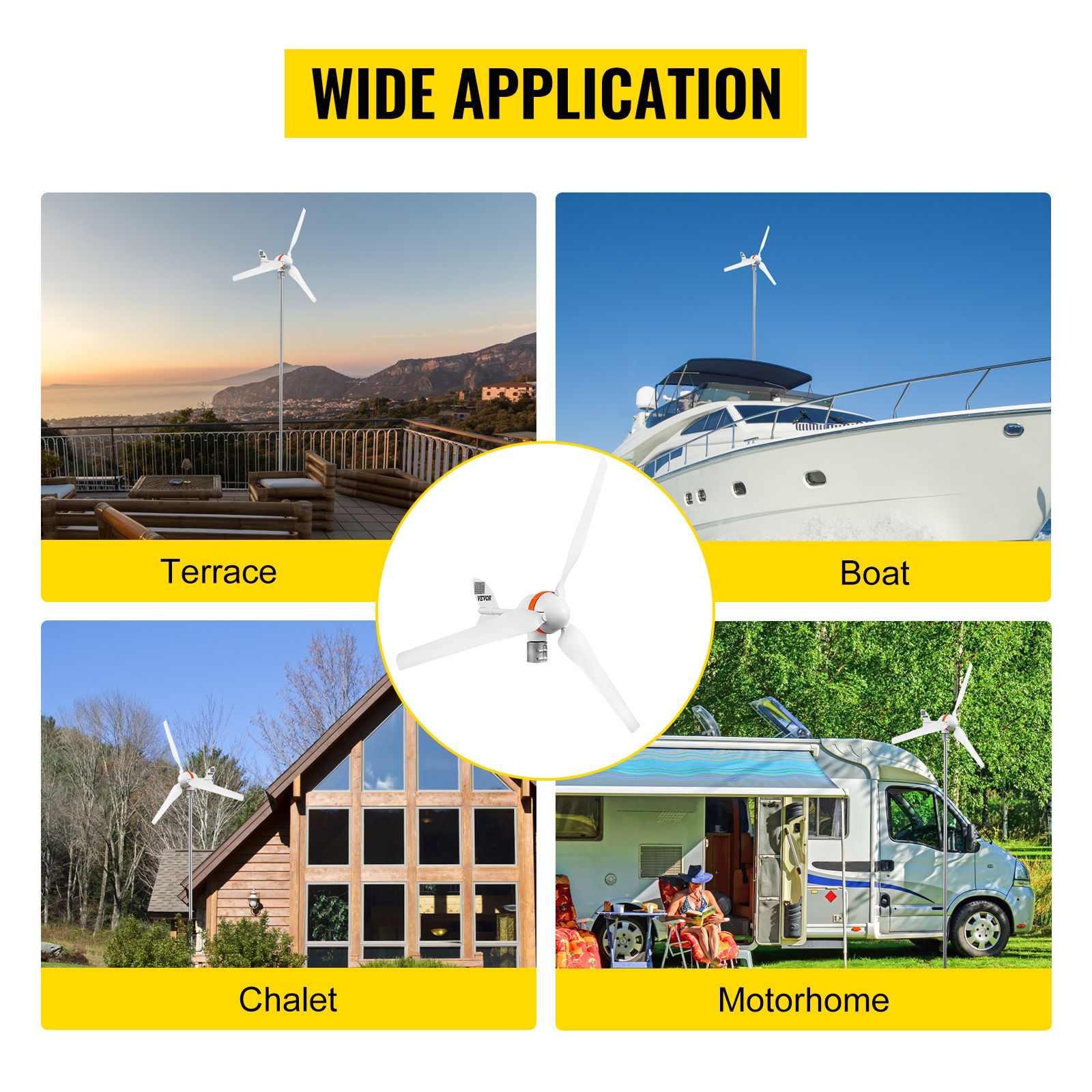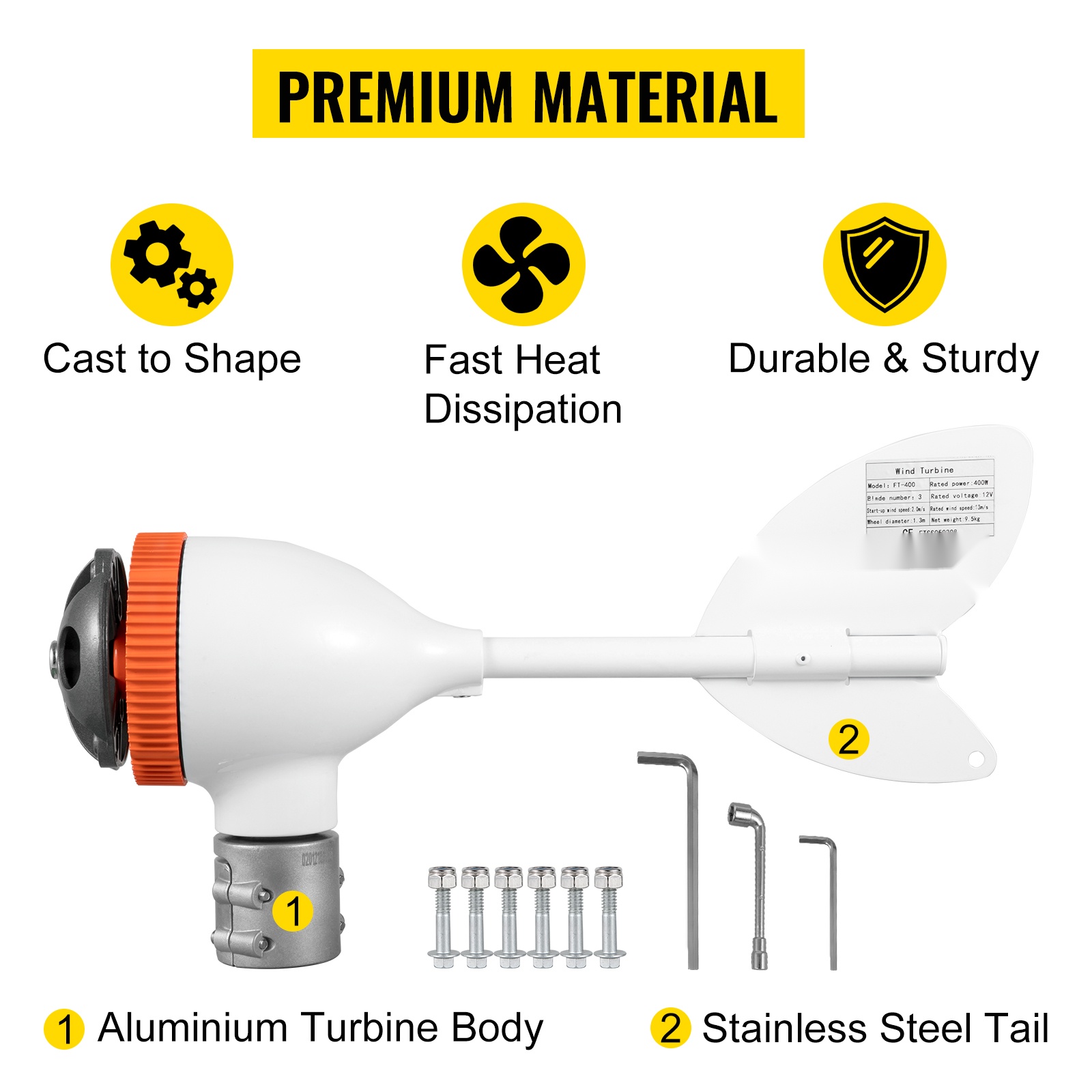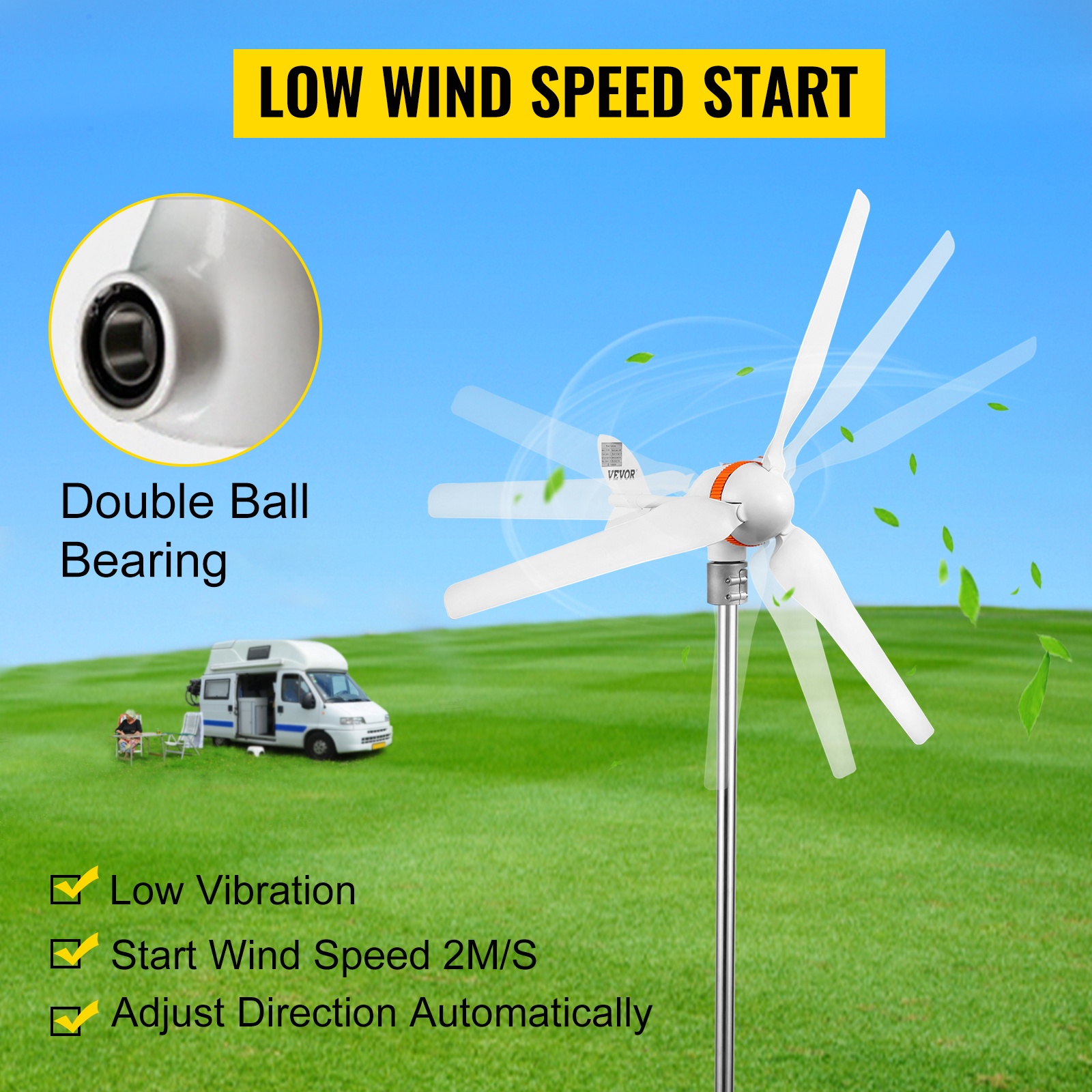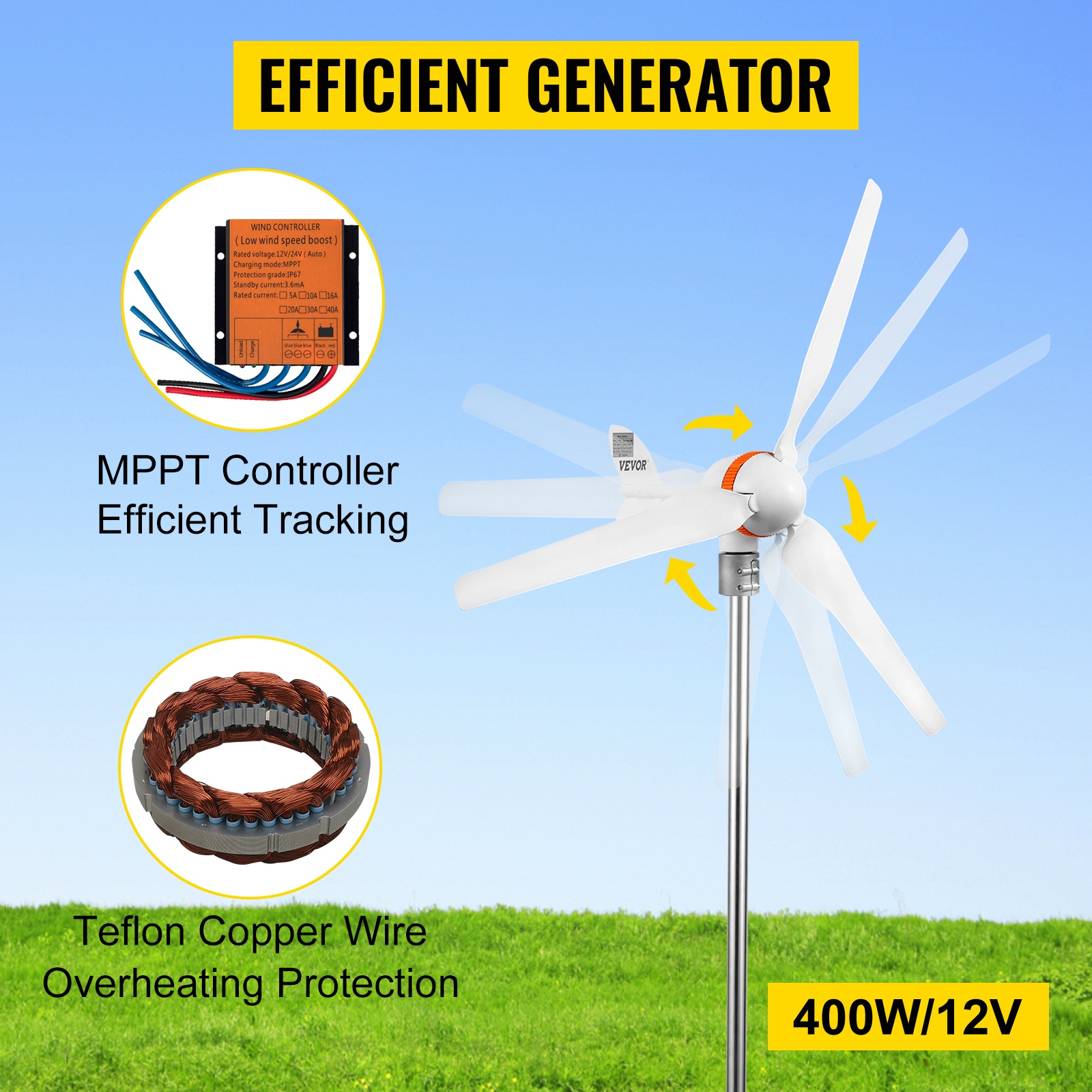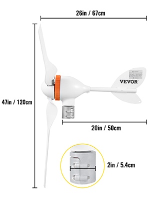 Tuuligeneraattorissa on alumiinirunko, ruostumattomasta teräksestä valmistettu perä ja nylon-kuitulavat. Kolmivaiheinen kestomagnettigeneraattori, ulkoinen MPPT-säädin ja kiinnitysvanne helpottavat asennusta ja parantavat hyötysuhdetta. Turbiini käynnistyy matalalla tuulennopeudella, hyödyntää tuulta tehokkaasti ja käy matalalla tärinällä. Soveltuu esimerkiksi veneisiin, pihoille ja muihin pienten lataustarpeiden kohteisiin.