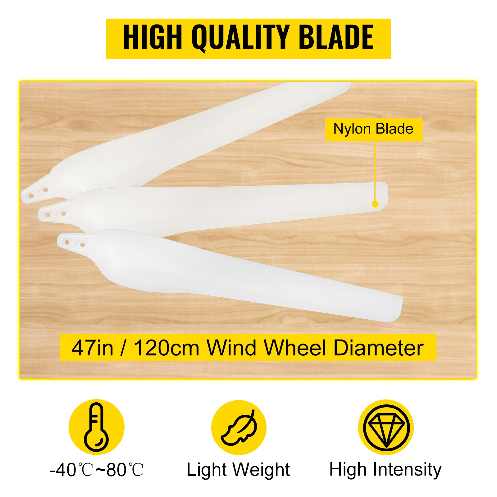 Mitä pidempi lapa, sitä enemmän tehoa turbiini tuottaa. Tässä mallissa lavat on valmistettu nylon-kuidusta, ja roottorin halkaisija on 43 in/1.1 m. Nylon on kevyt, vedenkestävä ja korroosionkestävä materiaali. Käyttölämpötila-alue on -40℃~80℃, joten turbiini sopii vaihteleviin sääolosuhteisiin.